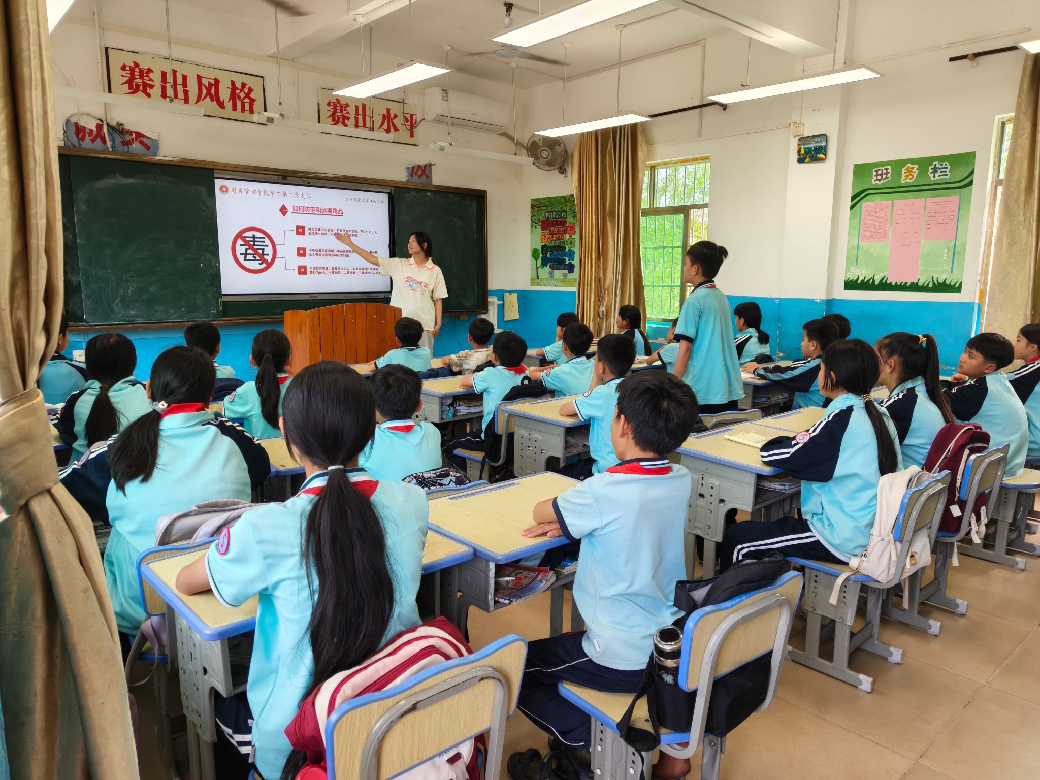 在水头小学教室里,财务管理学院师生用通俗易懂的语言,向小学生们讲解校园霸凌案例及其预防措施,介绍了生理卫生知识、性别差异、心肺复苏操作方式以及日常生活中自我保护等内容。通过展示毒品仿真模型、讲述真实案例,让小朋友们直观地了解毒品的种类、危害以及如何防范毒品侵害,在他们心中种下“珍爱生命,远离毒品”的种子,提高对毒品的警惕性和防范意识。