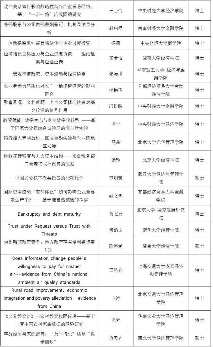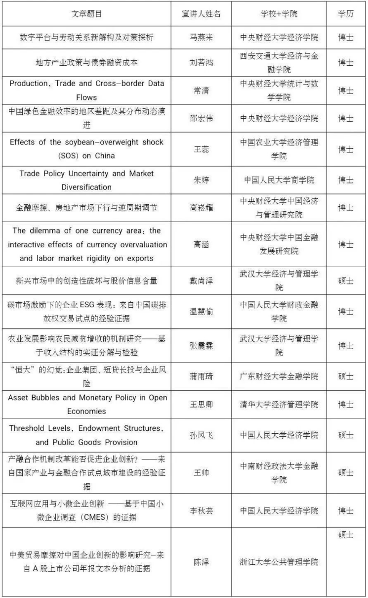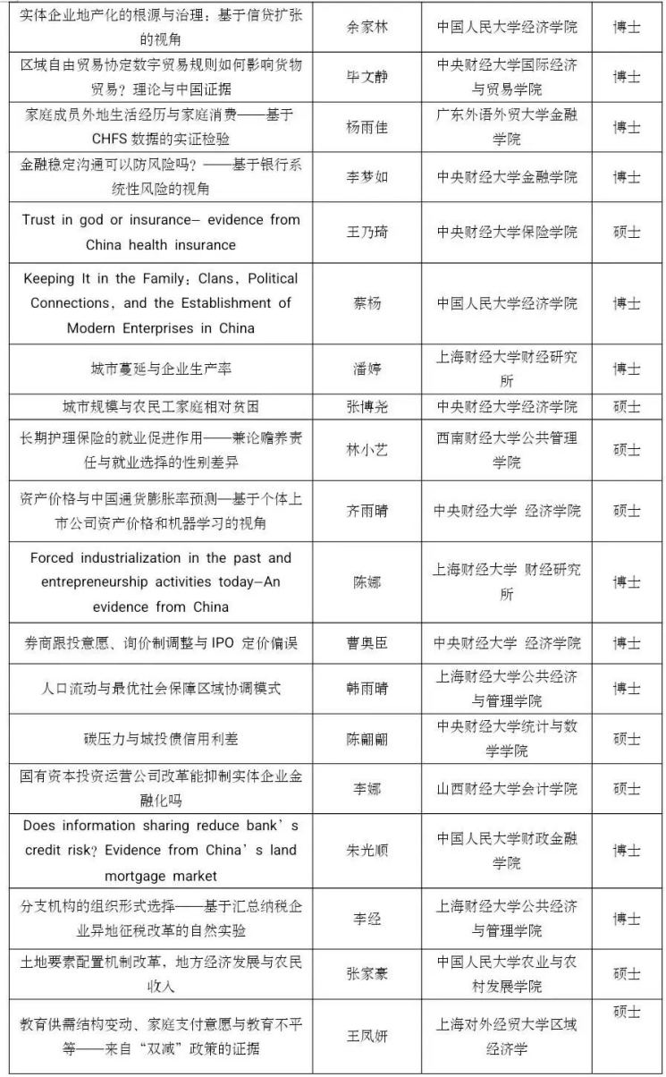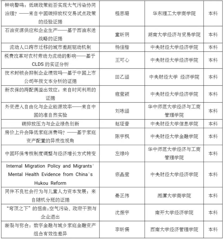 党的二十大报告指出,“教育、科技、人才是全面建设社会主义现代化国家的基础性、战略性支撑”。为了学习、贯彻和落实党的二十大关于教育和人才建设的精神,开云kaiyun体育联合中国经济学年会、中国青年经济学家联谊会主办第五届未来经济学家论坛。本论坛坚持“公平、公正、公开”的原则,鼓励思想争鸣、学术创新,旨在为未来有志于从事经济学研究的全国高校在校学生(本科生和研究生)提供一个观点交流、思想碰撞的学术交流平台。本次论文征集环节共收到612篇投稿论文,经过评审论证和评审,最终遴选出126篇入围会议,名单如下,恭喜各位入选的同学: