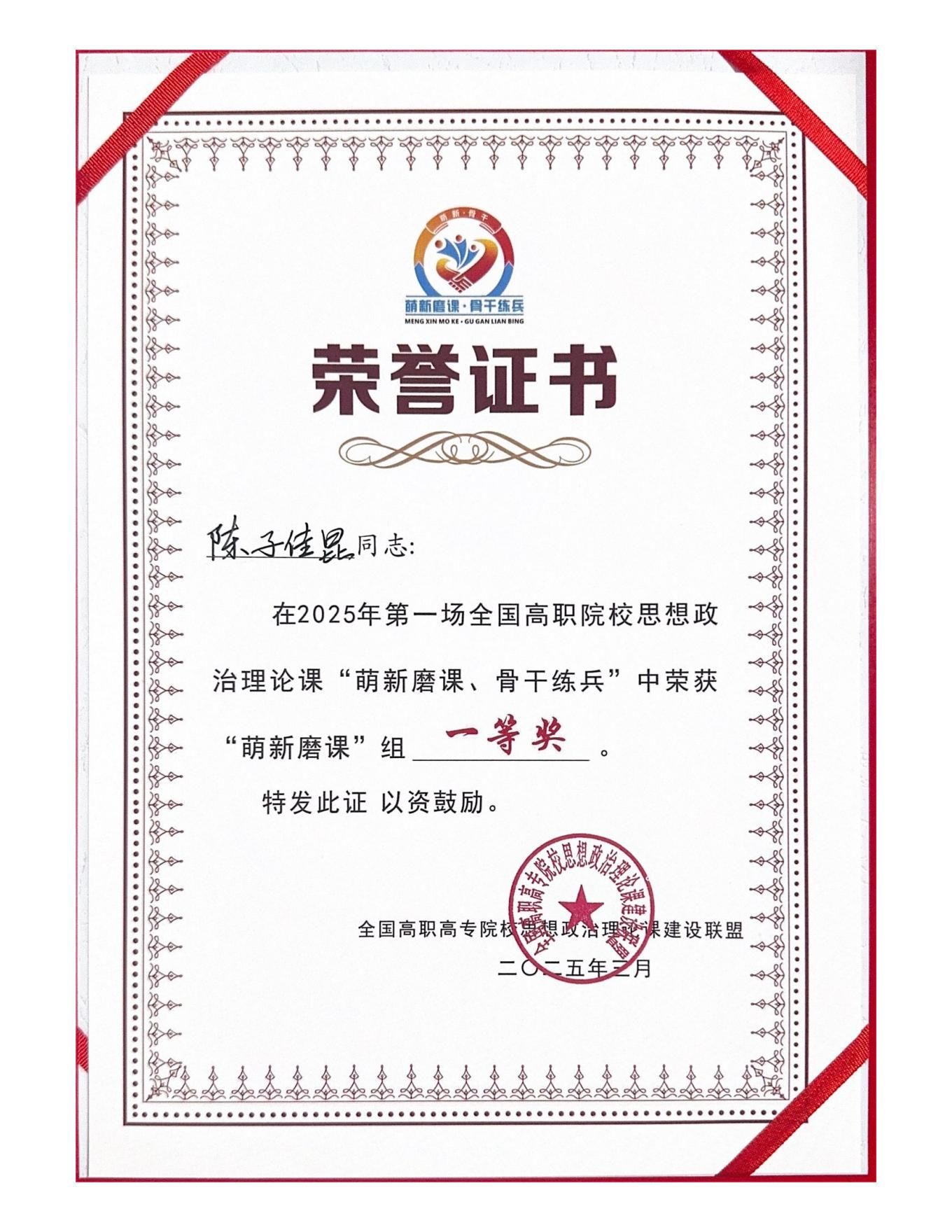 3月29日,2025年全国高职院校思想政治理论课第一场“萌新磨课、骨干练兵”教学展示活动在南宁圆满落幕。beat365英国官网网站陈子佳昆老师获得“萌新磨课”组一等奖,殷红梅老师获得二等奖。