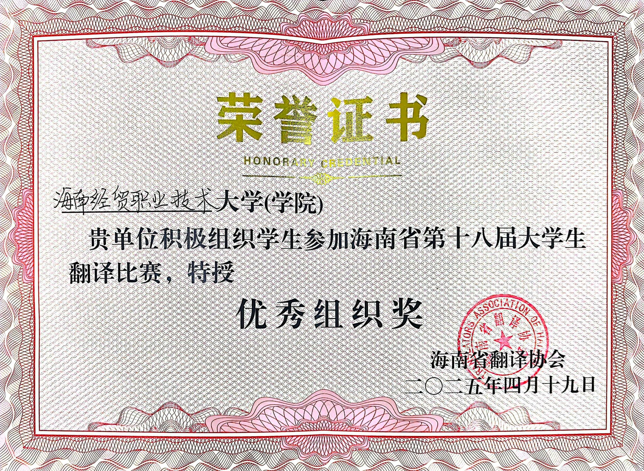 2025年4月19日,海南省第十八届大学生翻译比赛圆满落幕。beat365英国官网网站参赛选手们凭借扎实的语言功底和精准的翻译技巧,荣获3个一等奖、2个二等奖、4个三等奖,学校获得“优秀组织奖”。