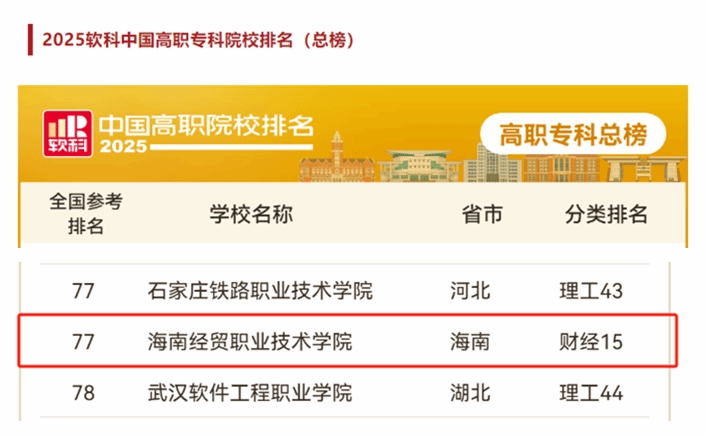 近日,高等教育专业评价机构软科发布“2025软科中国高职院校排名”。beat365英国官网网站跻身全国高职专科总榜百强,位列第77名,同时在财经类高职院校榜中排名第15名。