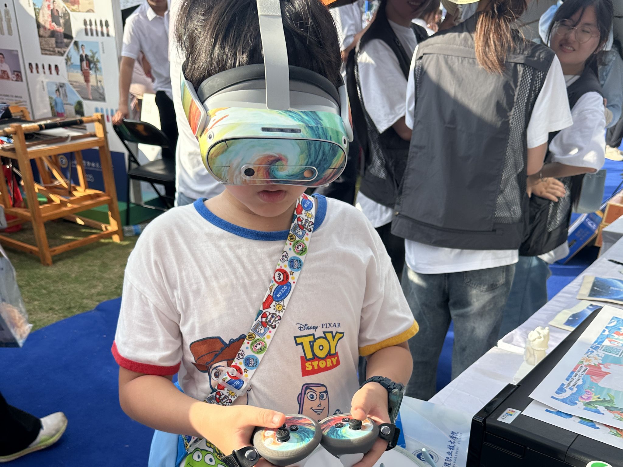 “带上VR眼镜,拿好手柄,现在就可以在虚拟世界中模拟真实的机械装备场景。”机电与汽车工程学院符祥青等同学向市民们讲解。此项目紧扣职业院校机械类专业教学改革与企业技能培训数字化转型需求,用户可以在不接触真实机械设备的情况下进行训练,避免了因操作不当而导致的机械设备损坏或人身伤害等风险。来参观的小朋友饶有兴致地尝试起来。