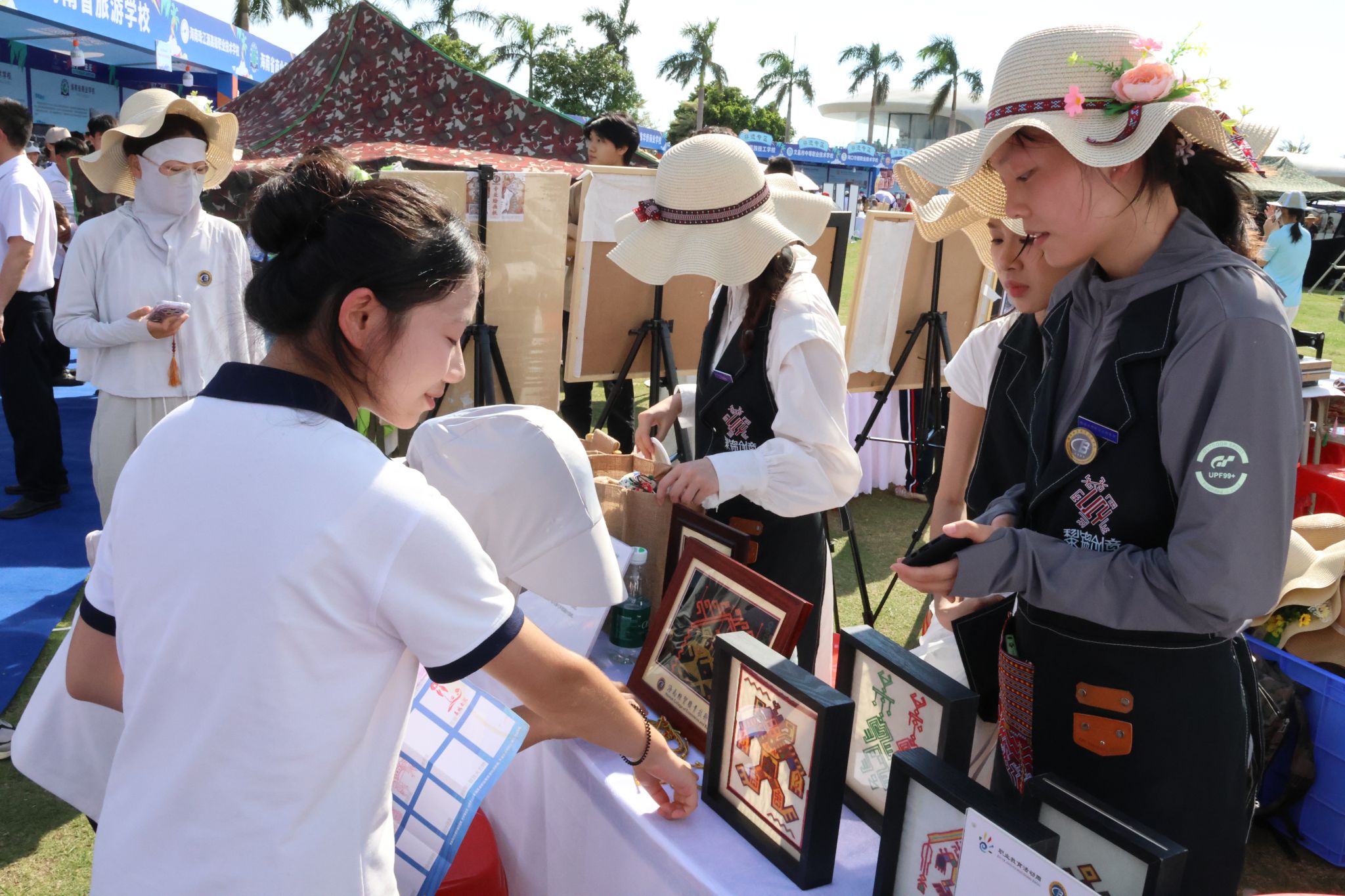 人文艺术学院服装与服饰设计专业技能展示区让大家亲自体验黎族织锦,感受千年非遗技艺的魅力。充满黎锦元素的现代服饰作品,体现了技艺的传承和职业教学的创新实践。DIY帽子、端午节香包、五彩绳……市民们热情高涨、积极参与其中,满载而归,收获了琳琅满目、丰富多样的民族风特色小礼品,现场气氛热烈。