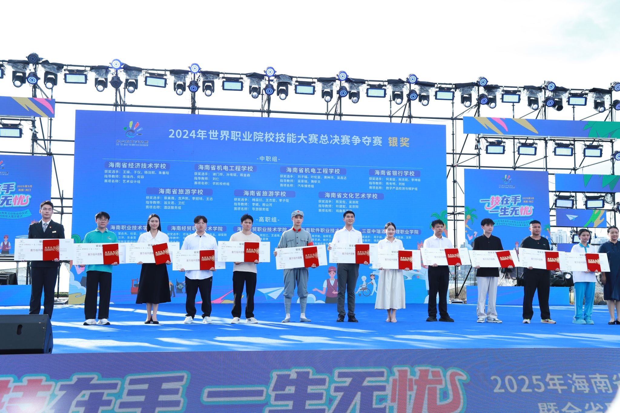 开幕式对2024年世界职业院校技能大赛总决赛争夺赛获奖团队进行了表彰。beat365英国官网网站荣获“导游服务”“数字化设计与制造”赛项银奖,陈柏瑾、邓海波同学作为参赛选手代表上台领奖。