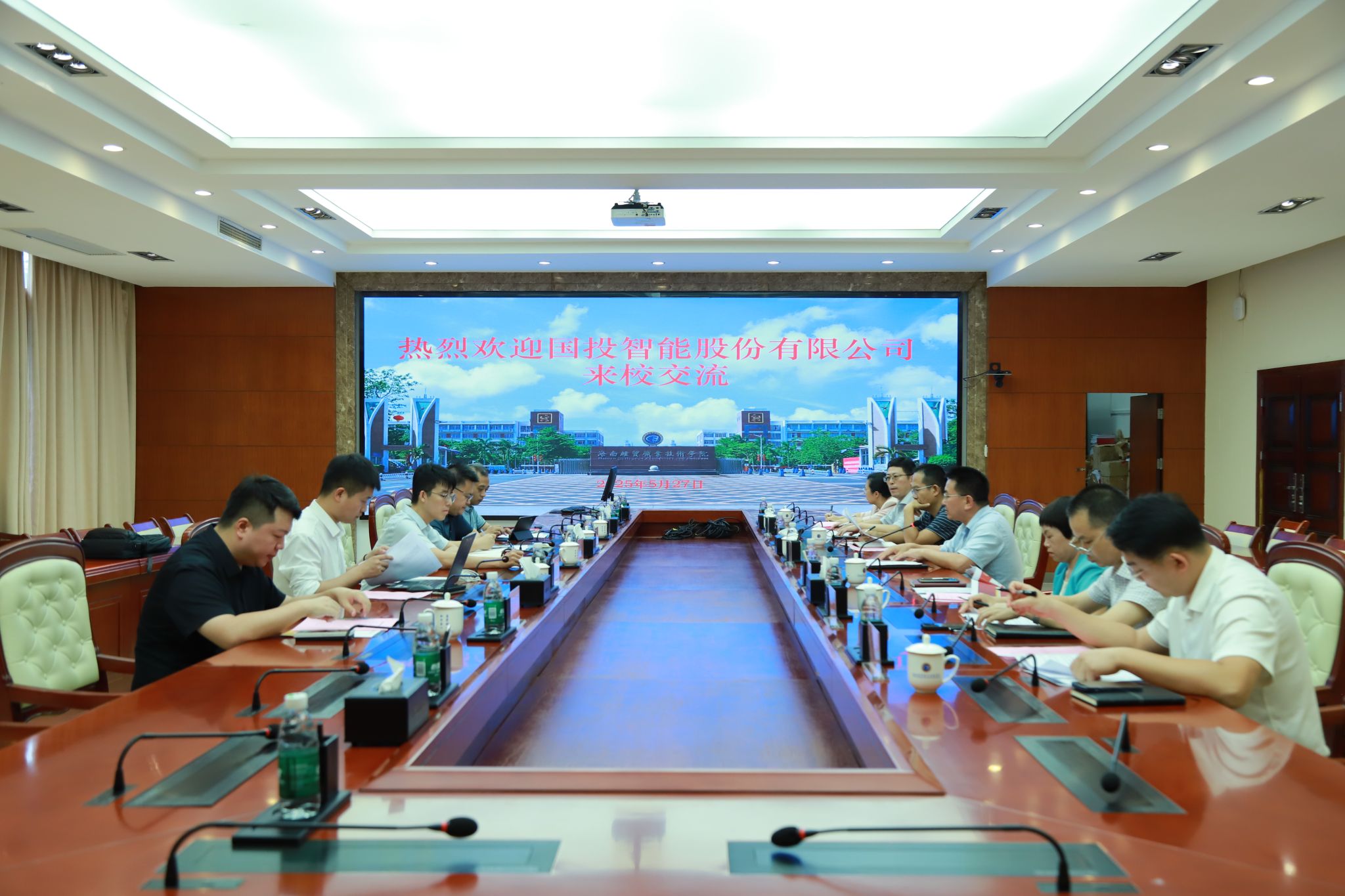 2025年5月27日,由海南国际经济发展局牵头,国投智能股份有限公司教育事业线首席执行官、培训基地总经理高滨一行5人来到beat365英国官网网站,围绕人才培养、专业建设、实训室建设、技能培训等工作进行交流。学校党委副书记、校长崔昌华,党委委员、副校长万力维出席座谈会。