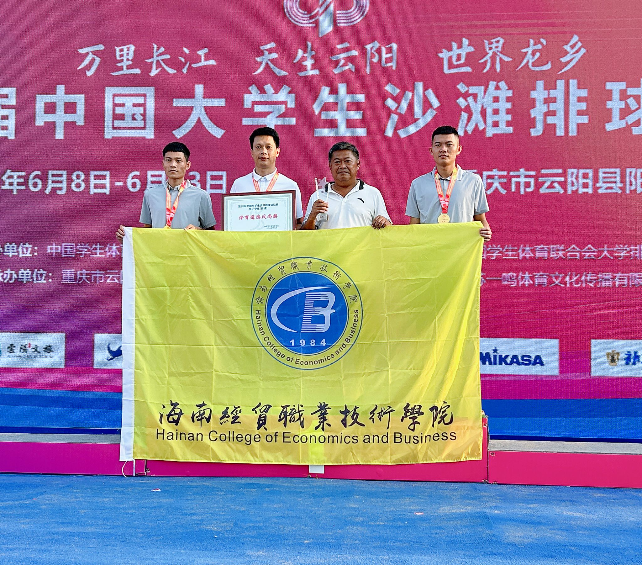 2025年6月8日-13日,第十八届中国大学生沙滩排球锦标赛在重庆市云阳县阳光沙滩展开激烈角逐。beat365英国官网网站队在决赛中以2:0战胜海口经济学院队,成功夺得全国冠军。这是继海经贸蝉联第十六届、十七届中国大学生沙滩排球锦标赛男子冠军后,再一次摘得比赛桂冠。在本次比赛中,学校荣获“体育道德风尚奖”。