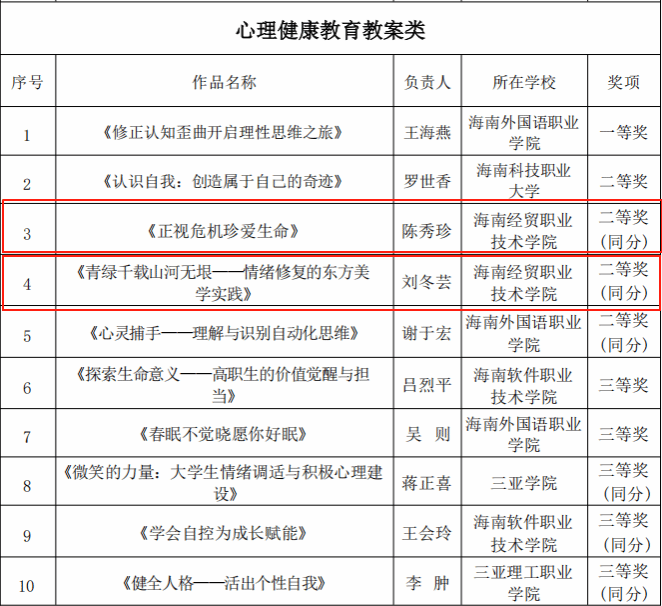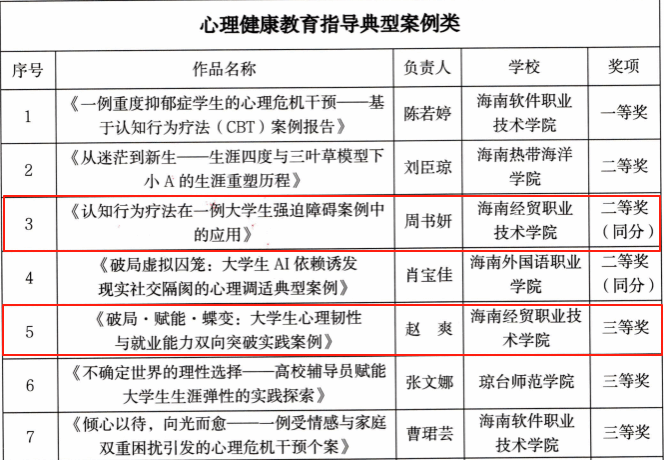 近日,2025年全省高校心理育人“五个一批”系列评选活动获奖作品公布。beat365英国官网网站选送的作品《认知行为疗法在一例大学生强迫障碍案例中的应用》《从“魔丸”到“英雄”——解密“哪吒”自我成长的力量》《青绿千载山河无垠——情绪修复的东方美学实践》《正视危机 珍爱生命》分别获得心理健康教育指导案例类、微课类、教案类二等奖;《破局 ·赋能 ·蝶变:大学生心理韧性与就业能力双向突破实践案例》获得案例类三等奖。beat365英国官网网站荣获“优秀组织单位奖”。