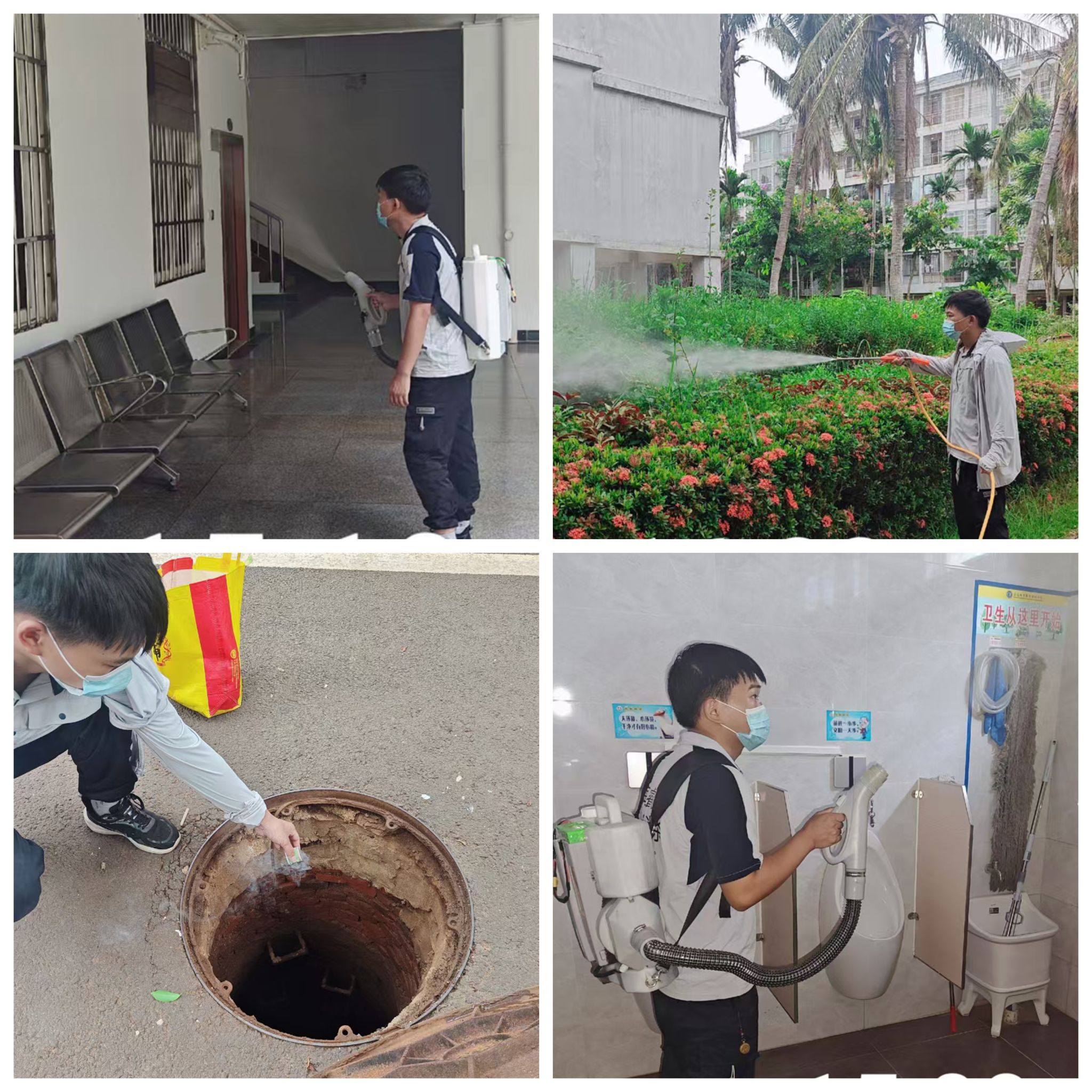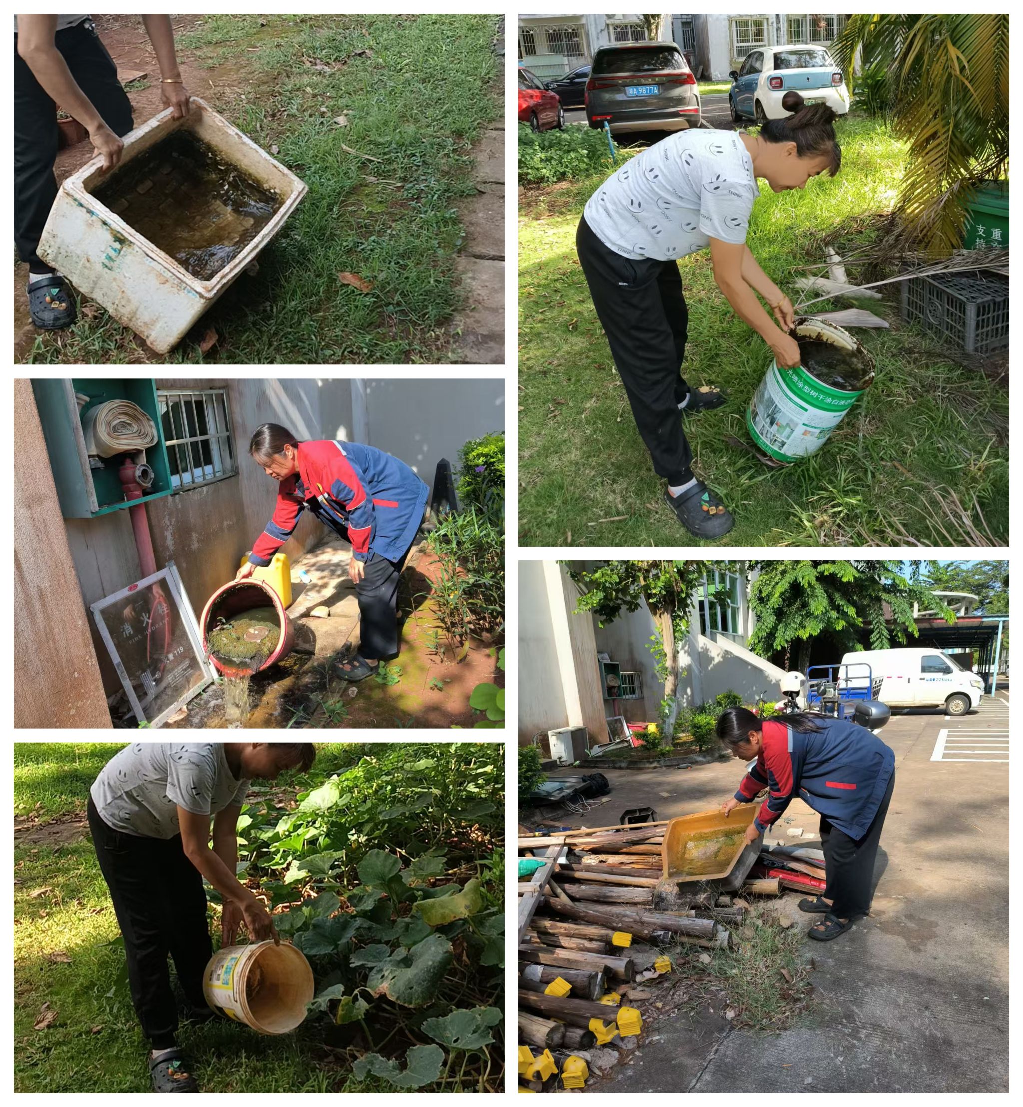 在学校领导的带领下,教职员工仔细清扫责任区域,及时清理卫生死角。后勤人员全面排查并清除校园内闲置盆罐的积水,做好垃圾清运;环保工人对校园进行“除四害”消杀,针对重点区域进行滞留喷洒和空间喷雾,对蚊蝇孳生栖息地如下水井、垃圾房等实施烟雾熏蒸和滞留喷洒。教职工宿舍区住户也主动排查房屋周边、花园阳台、天台、水池及绿化带等区域,及时清理废弃容器杂物中的积水。