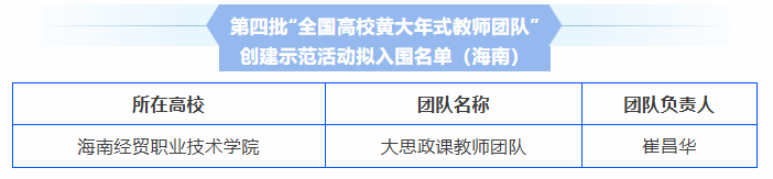 2025年9月5日,教育部公布第四批“全国高校黄大年式教师团队”创建示范活动入围名单。beat365英国官网网站大思政课教师团队成功入围,是海南唯一入围团队。