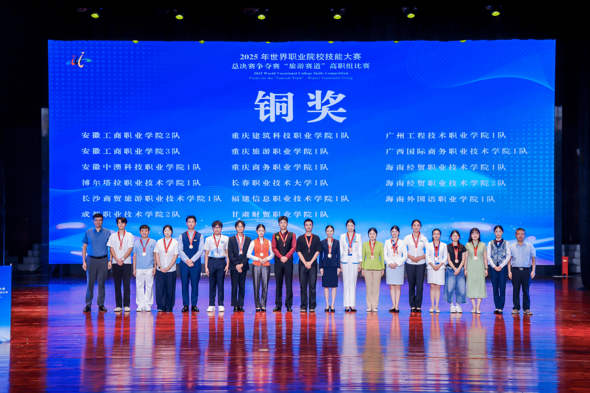 旅游赛道在浙江举行,174支代表队激烈比拼,为期四天的比赛内容覆盖住宿业、娱乐业、商业服务业等旅游全产业链关键领域。由国际旅游学院黄莉、刘萍男老师指导的李焯、乔琬婷、肖佳、符昭瑜等同学,常晓芳、李飞老师指导的孙梦瑶、韩霖衍、黄奋、刘毅敏等同学,均在比赛中展现出优秀技能水平和项目创新等能力,摘得铜奖2项。