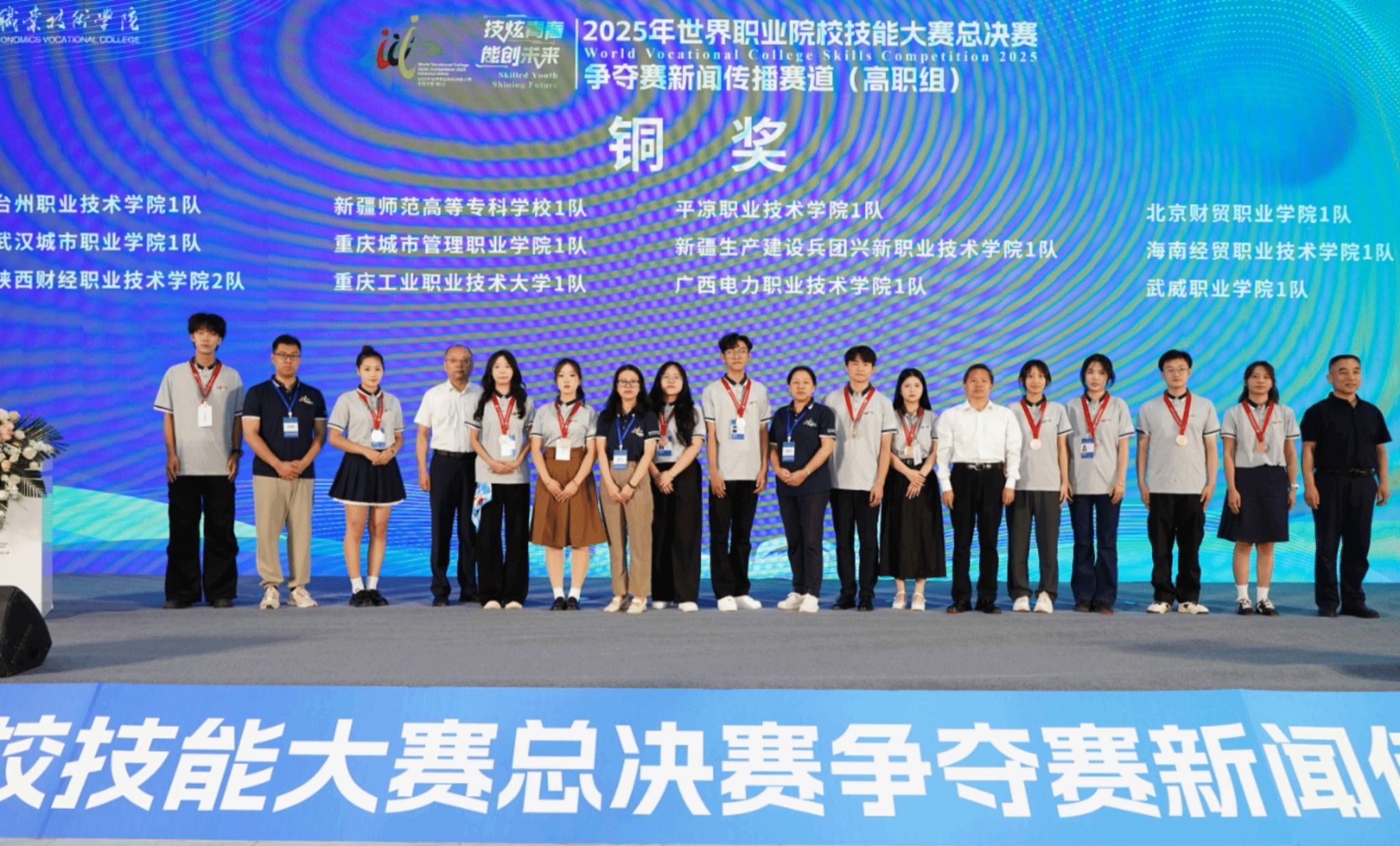 新闻传播赛道在宁夏举行,全国122支参赛队同台竞技。选手们以精湛的技艺和昂扬的姿态,通过短视频制作、全媒体运营等项目,充分展现出“懂传播、善创新、能实践”的专业培养目标。人文艺术学院冯苒苒、蔡于博老师指导,融媒体技术与运营专业林意霞、欧雅兰、黎绮雯、林智莹等同学团结协作,完成内容策划、技术应用及职业素养等综合呈现,获得铜奖。