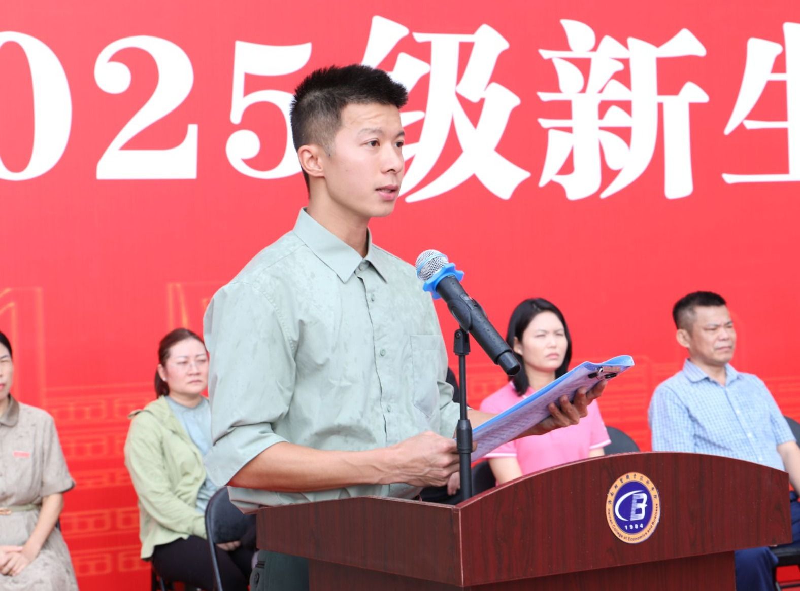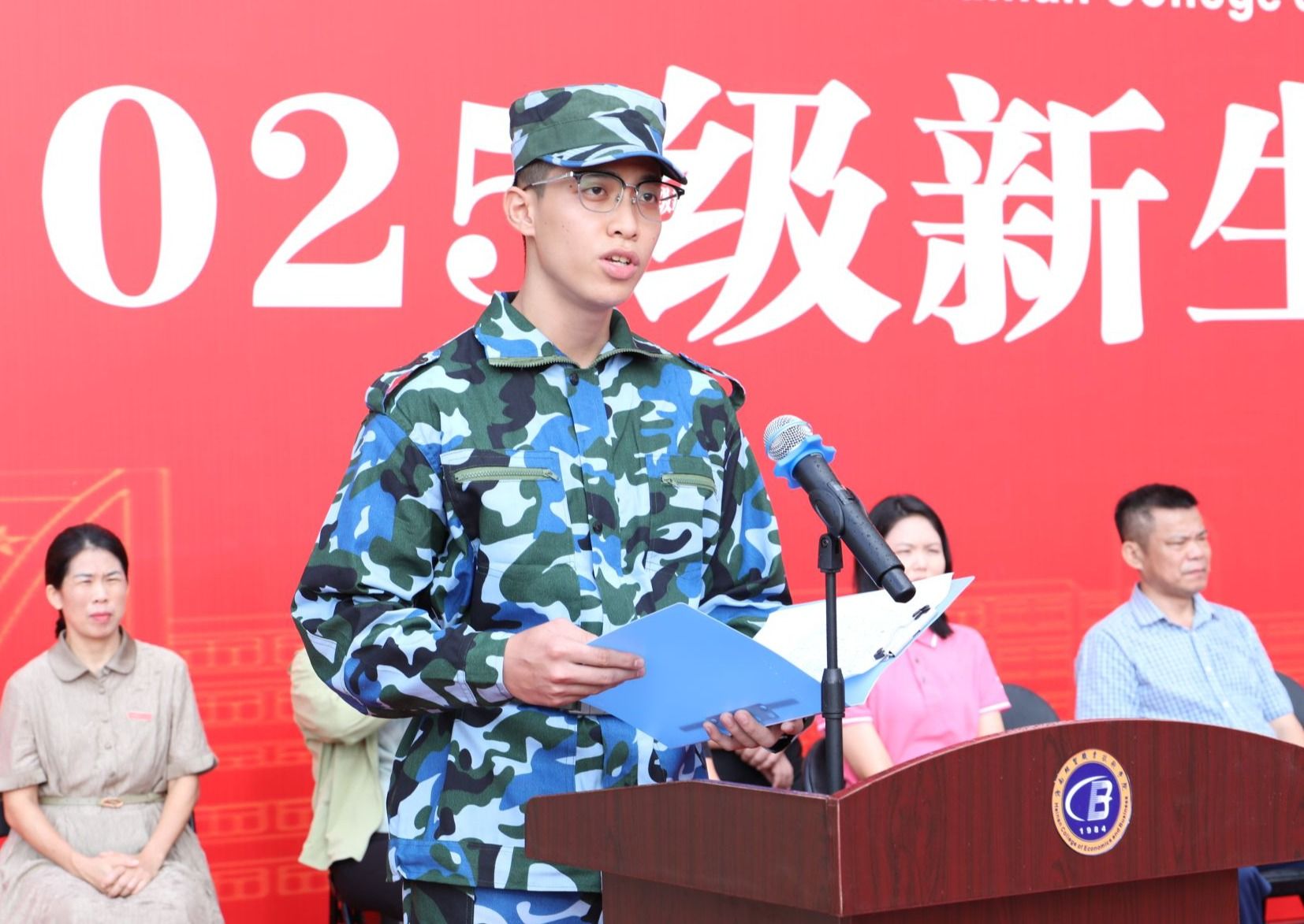 退伍复学学生代表曾德惠回顾了自己在部队中的军旅生活,勉励新同学们把每一次训练都当“实战”,对自己多一份“较真”,把在军训中淬炼出的坚韧与勇气,当成未来大学生活里破局的锋芒、逐梦的铠甲,助力大家在学业探索与人生成长的路上,始终步履坚定、一往无前。