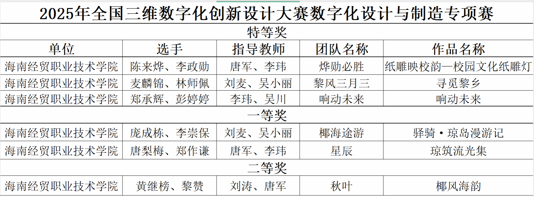 经过激烈角逐与严格评审,比赛最终评选出特等奖6名、一等奖6名、二等奖13名,特等奖作品将代表海南省参加全国总决赛。海经贸学子在省赛中取得3个特等奖、2个一等奖、1个二等奖的好成绩,“纸雕映校韵一校园文化纸雕灯”“寻觅黎乡”“响动未来”三项特等奖作品,将登上全国总决赛的舞台,向更高荣誉发起冲击。