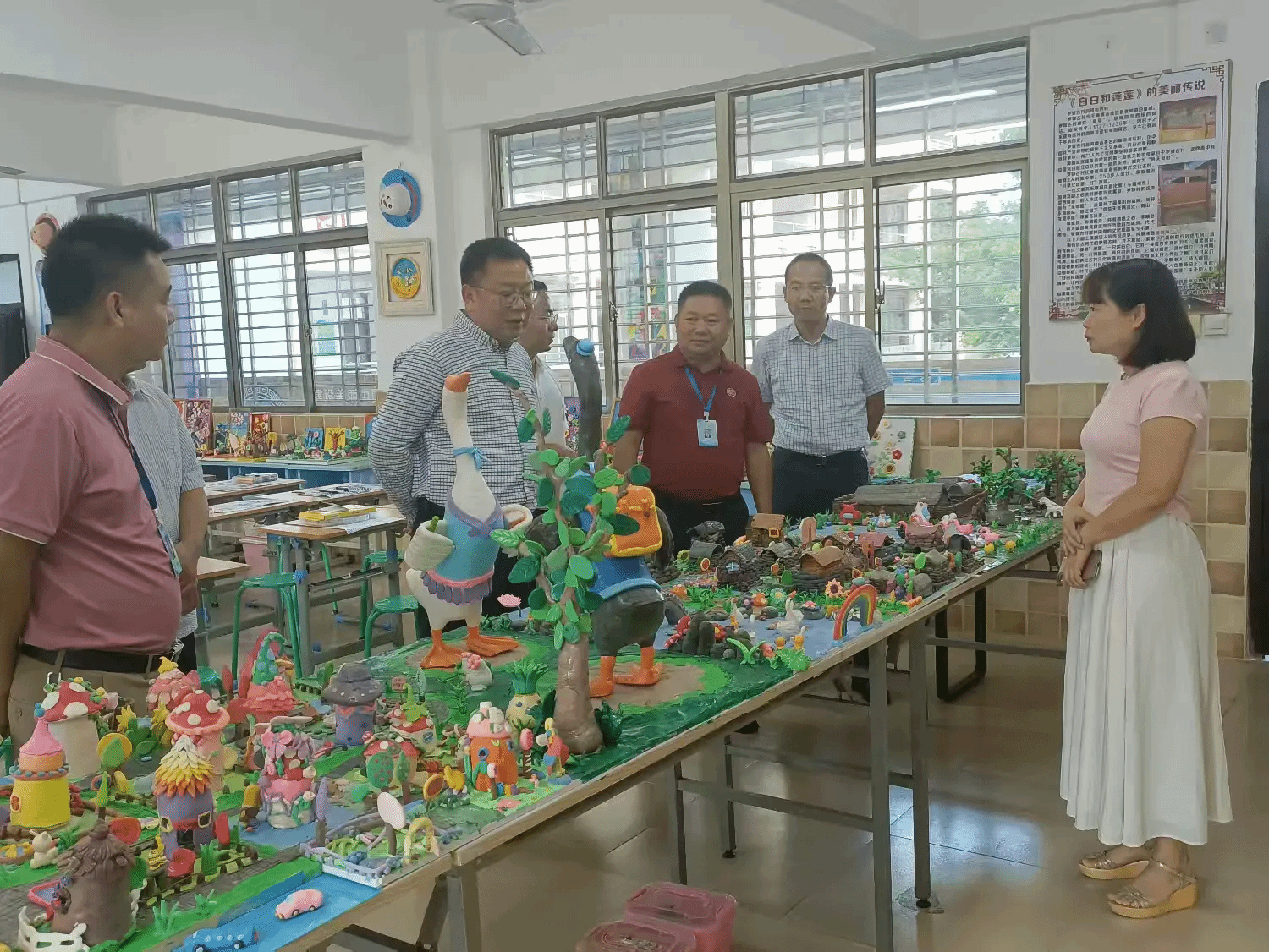 王华一行走进校园开展实地考察。从校门口到教学楼,他沿途仔细察看校园文化氛围提升后的实际效果,并就“如何让文化建设更贴近学生认知、更好营造育人氛围”提出优化建议。他仔细了解图书角的设施配备与使用情况,重点关注学生阅读环境的改善与功能升级。在美术室与科技室,王华亲身感受特色教学实践取得的丰硕成果,对白莲中心学校在艺术素养培育与科技创新教育方面所取得的成绩给予充分肯定,并结合实际情况提出具有建设性的指导意见。