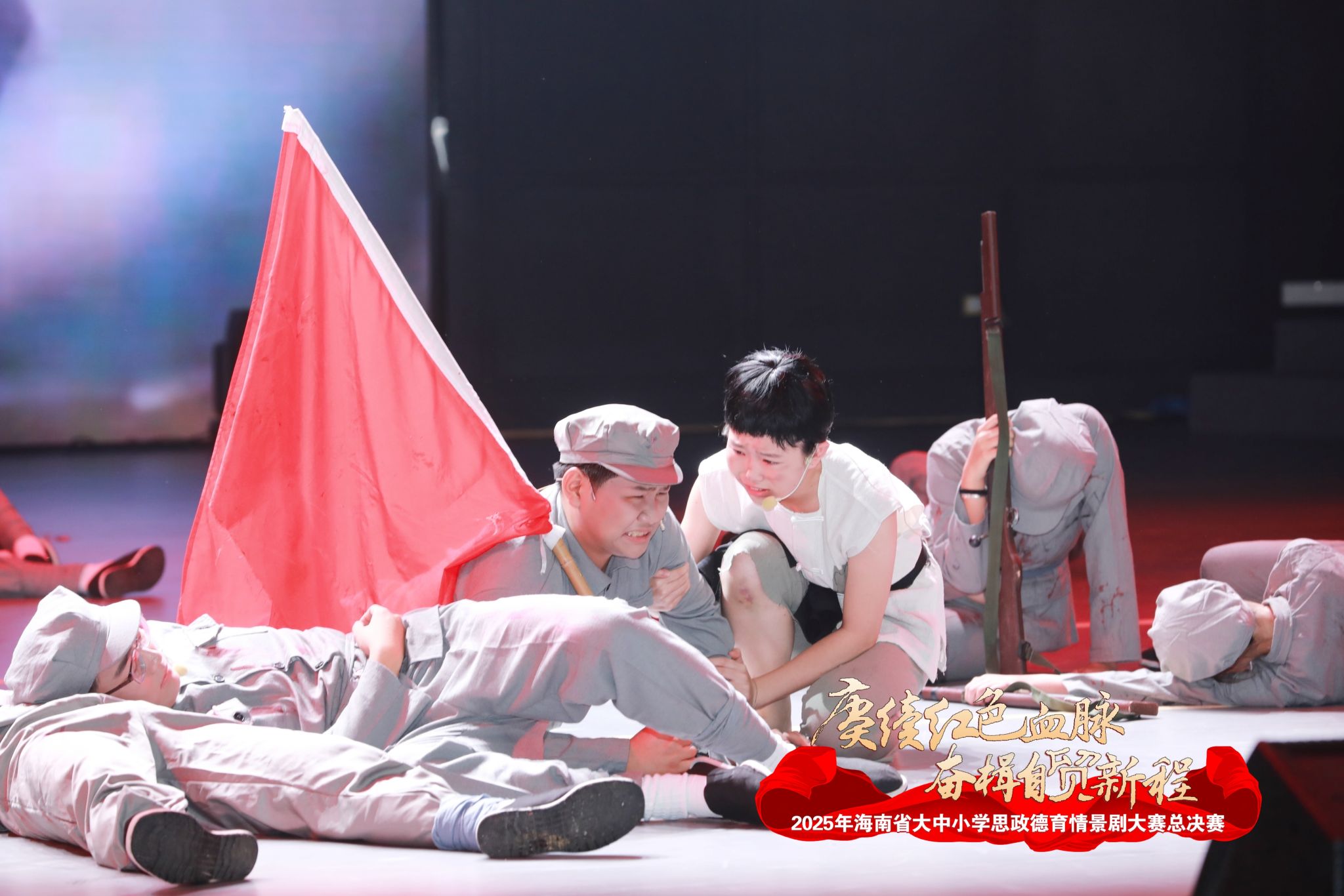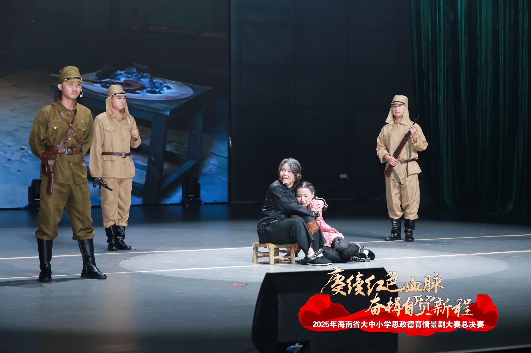 来自各二级学院的近30名师生历经一个多月刻苦排练、精心打磨,以精湛演绎在全省舞台绽放光彩。作品以抗日战争时期海南澄迈县老城镇朱献烈士 “绝不屈服母子英烈” 的事迹为原型改编。朱献投身琼崖抗日独立总队,带领安仁、东兴、白莲、老城四乡民众奋勇抗敌。日军为逼其投降,掳走他的母亲与妹妹。朱母深明大义,坚贞不屈,最终惨遭日军杀害。面对敌人的威逼利诱,朱献始立誓传承母亲遗训,继续抗敌御侮。这位英烈的墓碑上,“为人民而死,虽死犹荣”九个红色大字,镌刻着他的赤胆忠心。