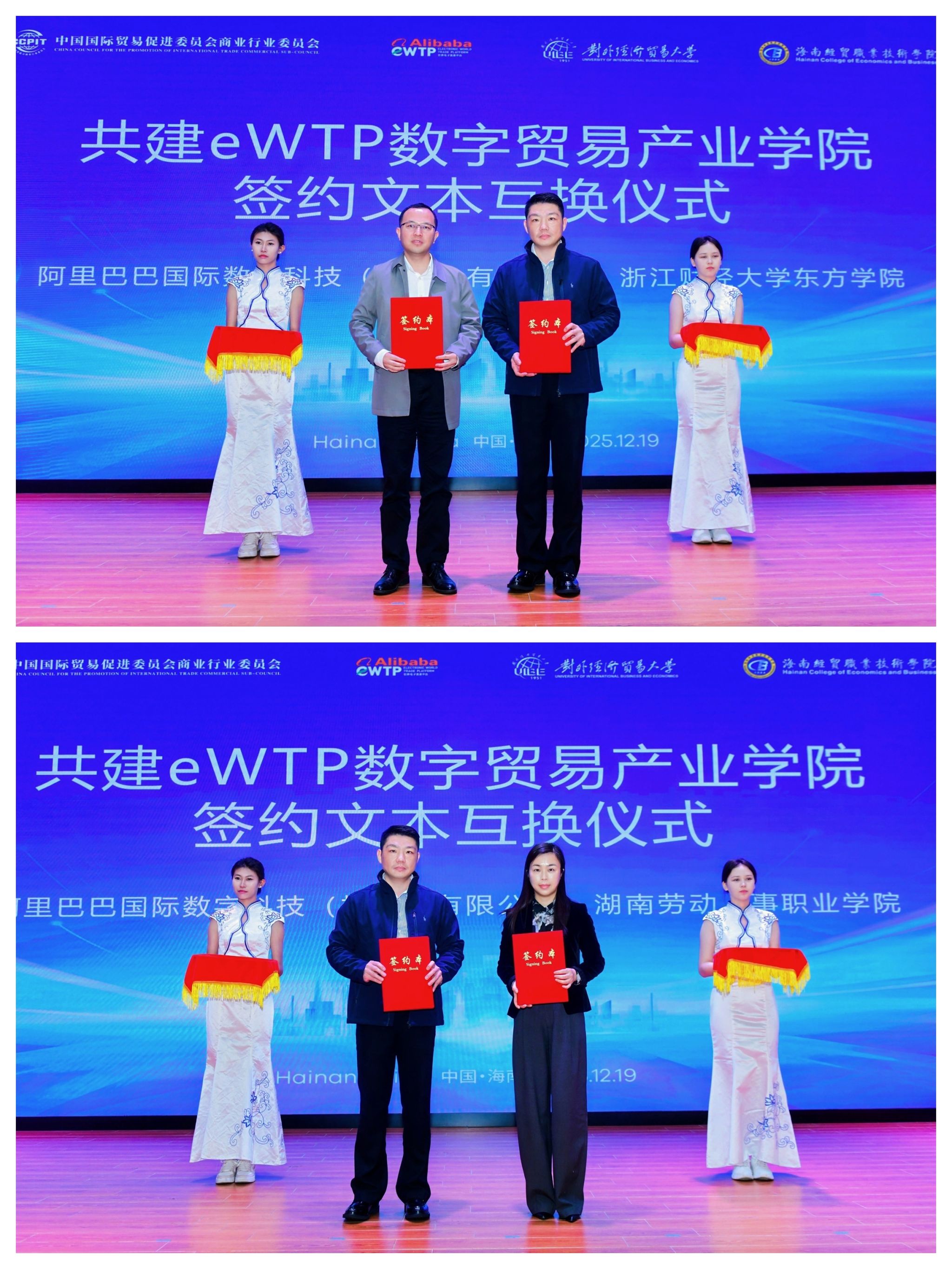 浙江财经大学东方学院院长童志锋、湖南劳动人事职业学院副院长张晓琳与阿里巴巴国际数字商业集团eWTP培训总监刘强举行产教融合合作协议文本互换仪式