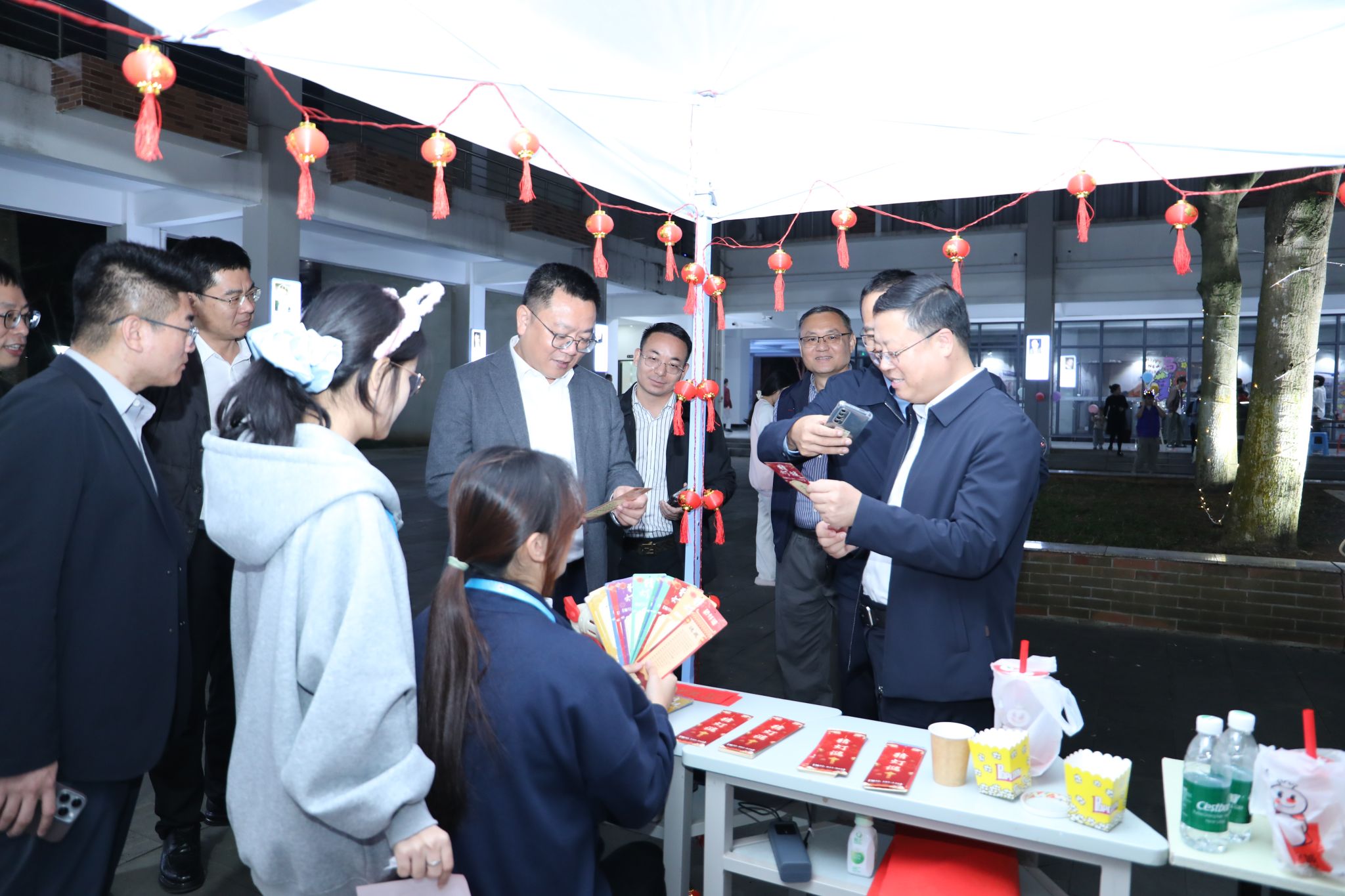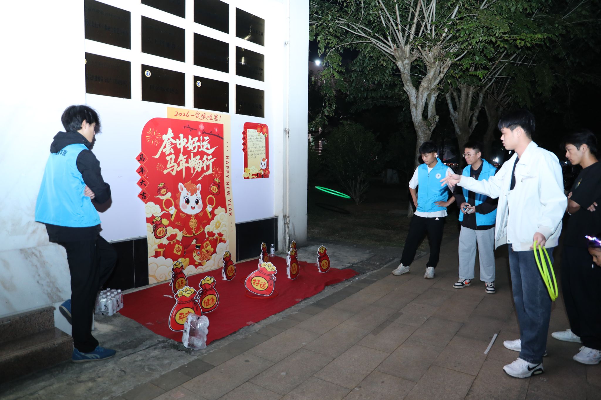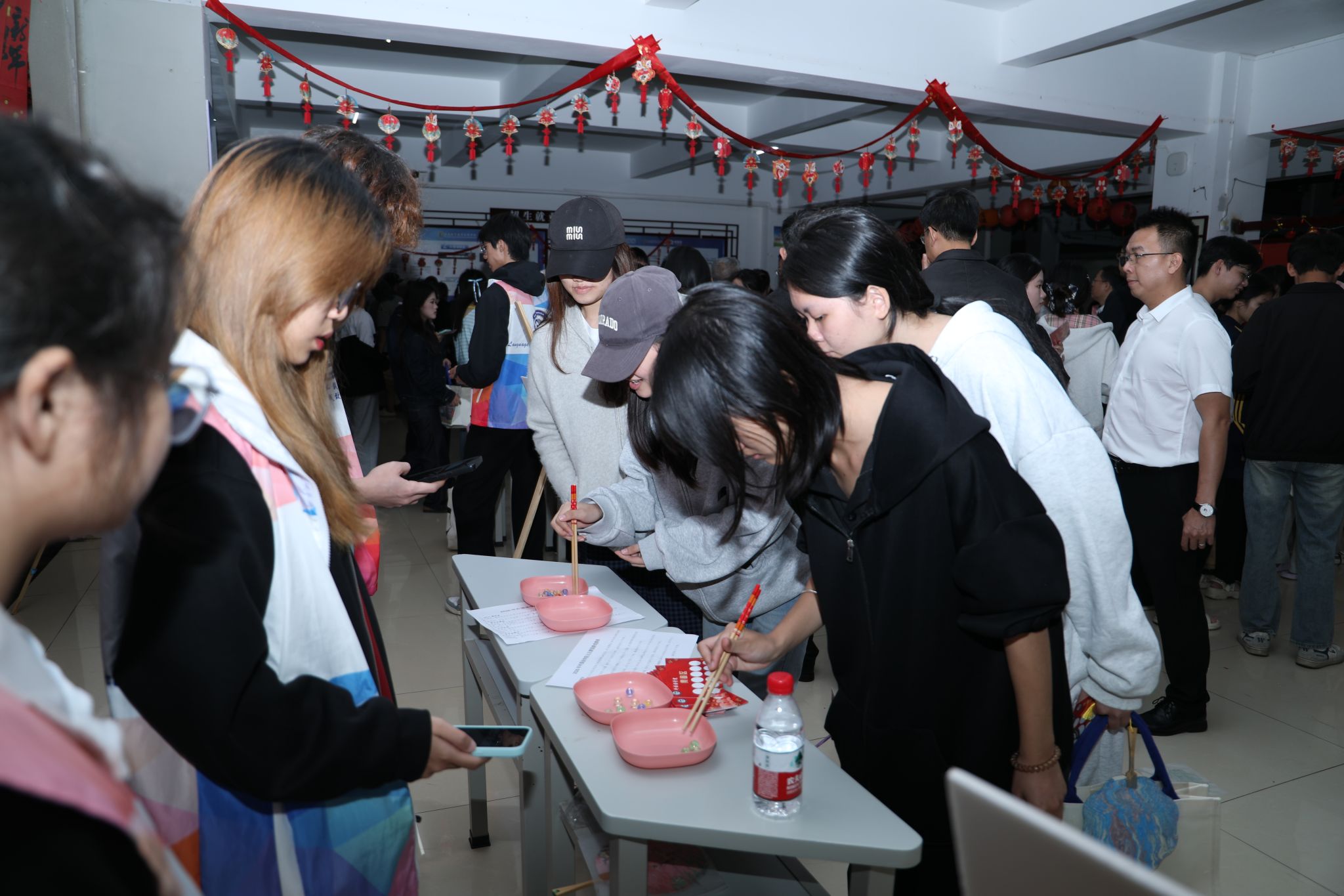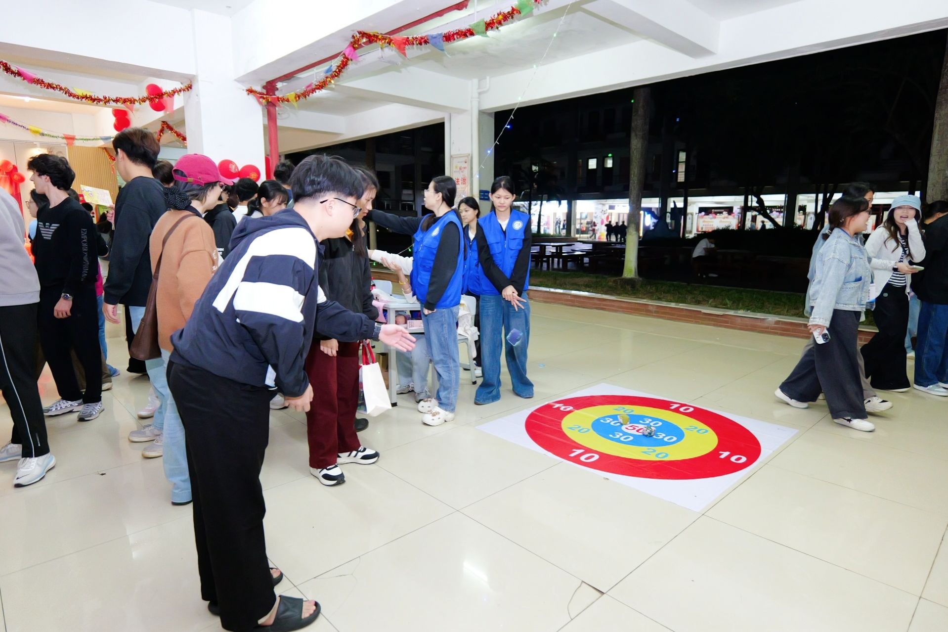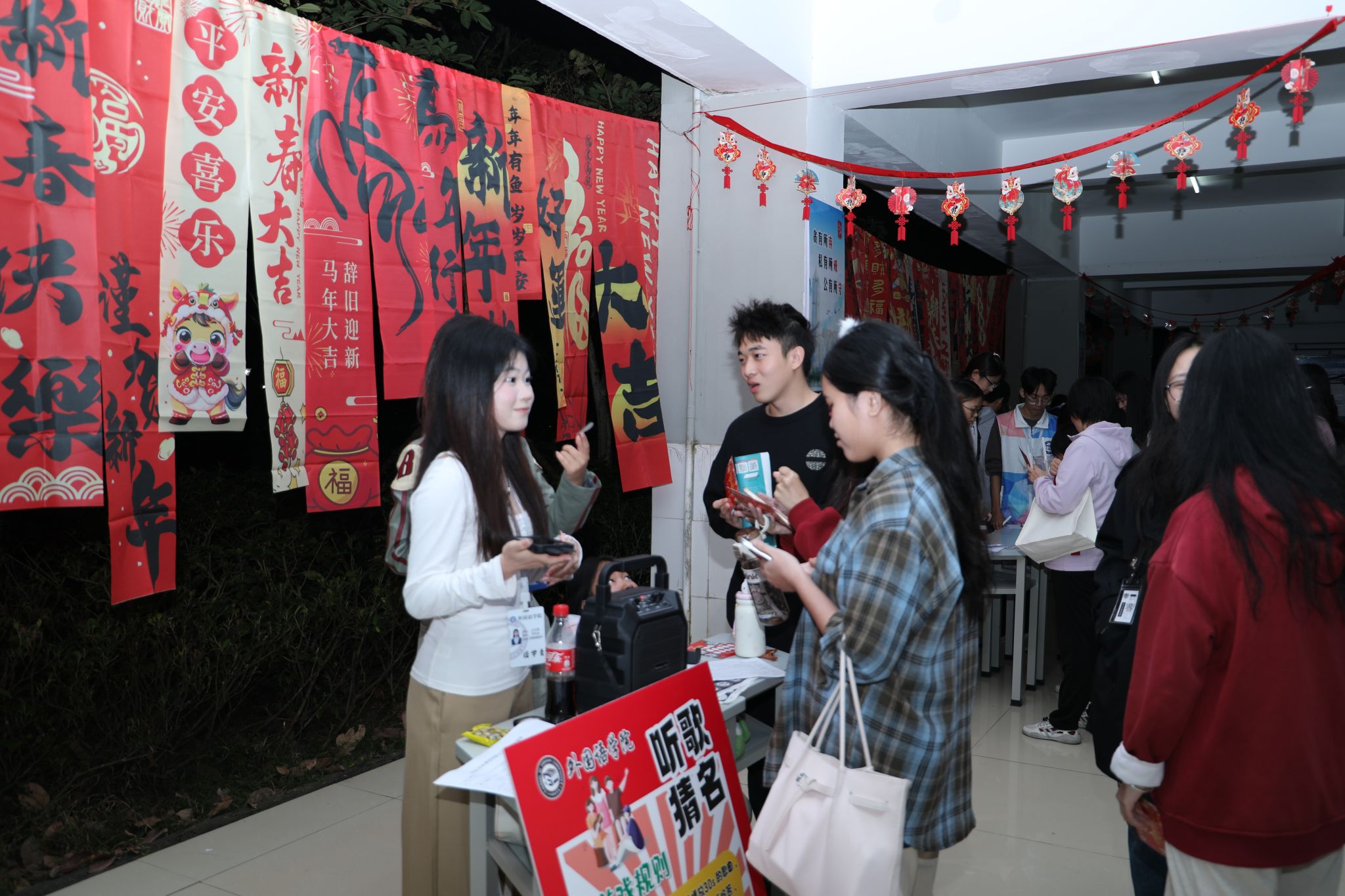 各二级学院还分别设置了各自的分会场,金珠大作战、蒙眼击鼓、你画我猜、漆扇制作、丢沙包、套圈……青春的活力与团聚的温暖在冬夜的校园里流动、汇聚。