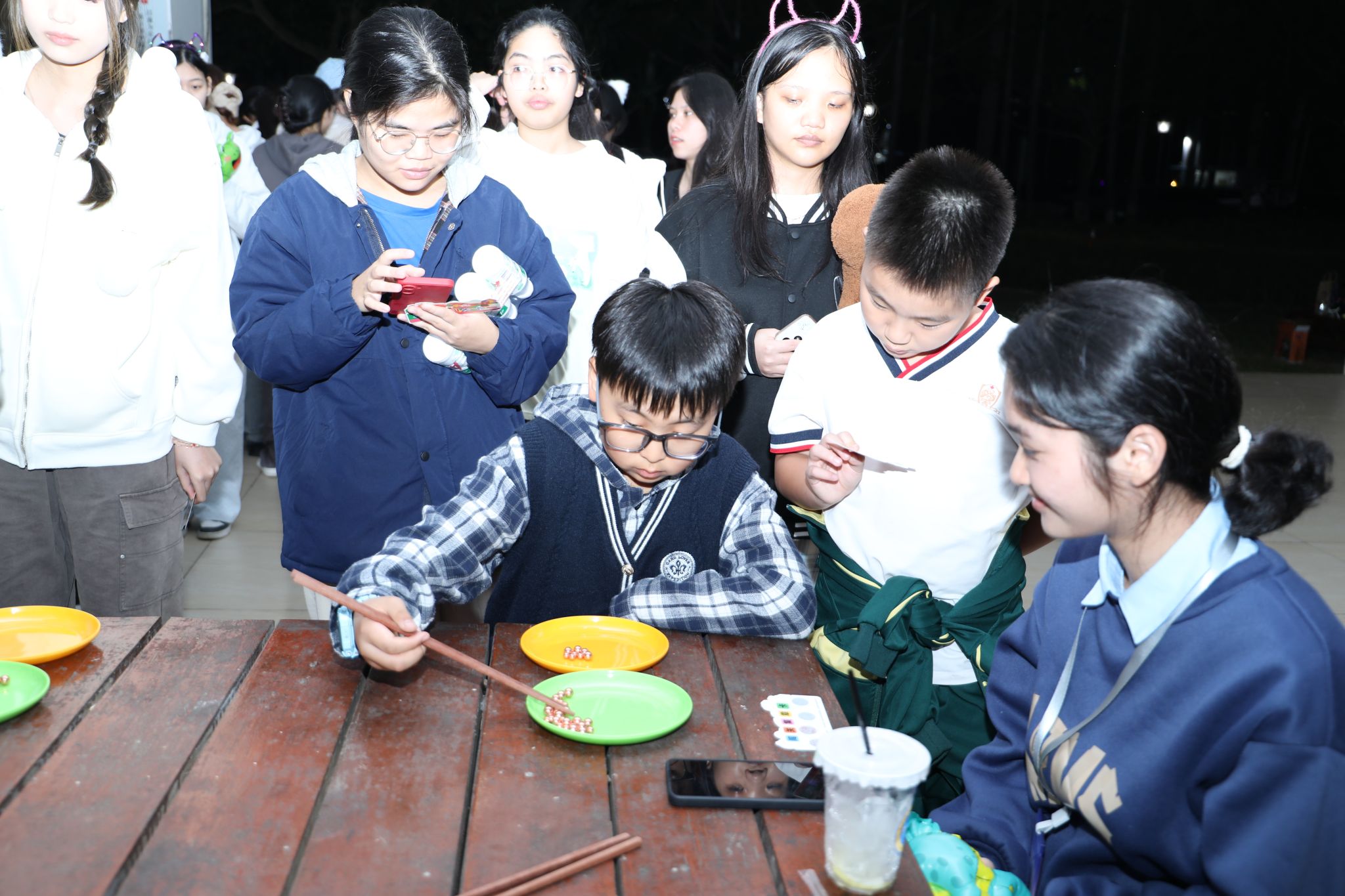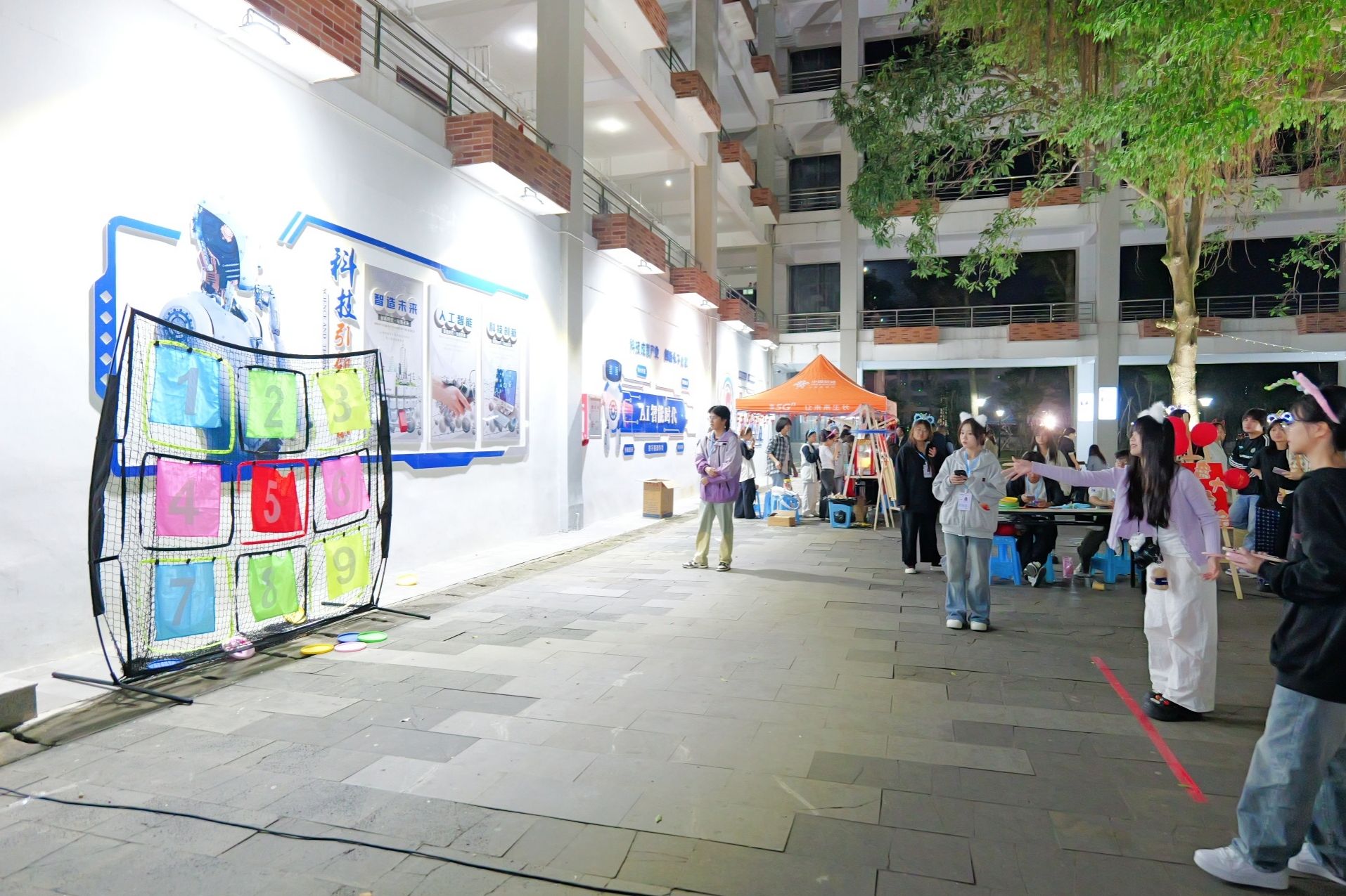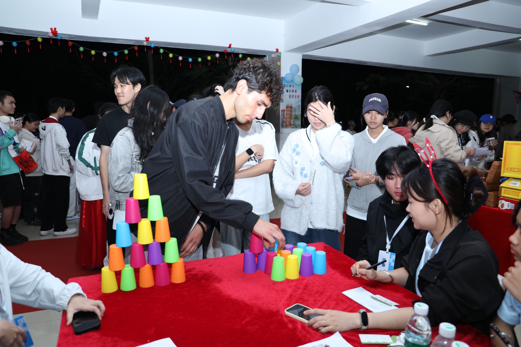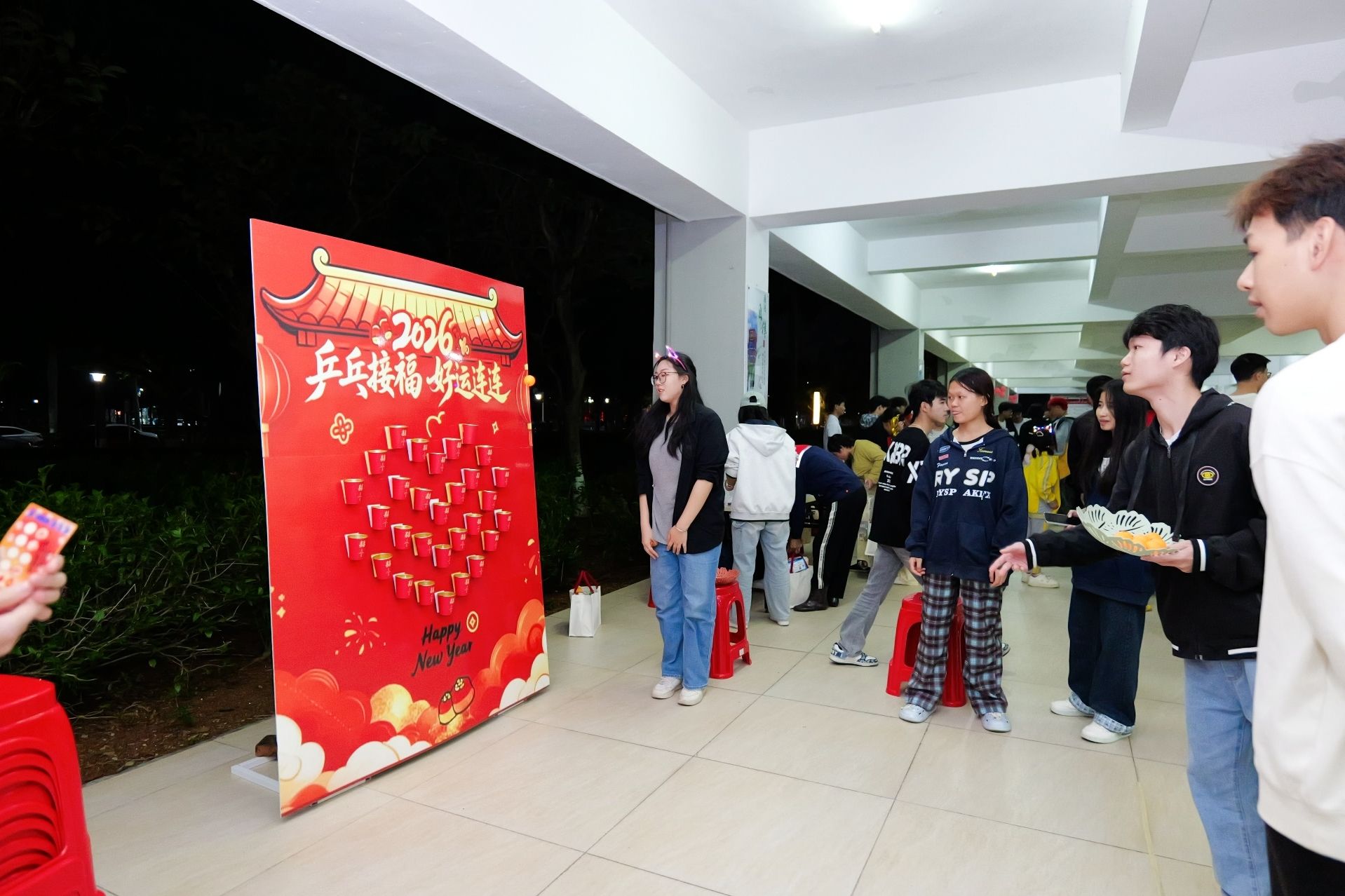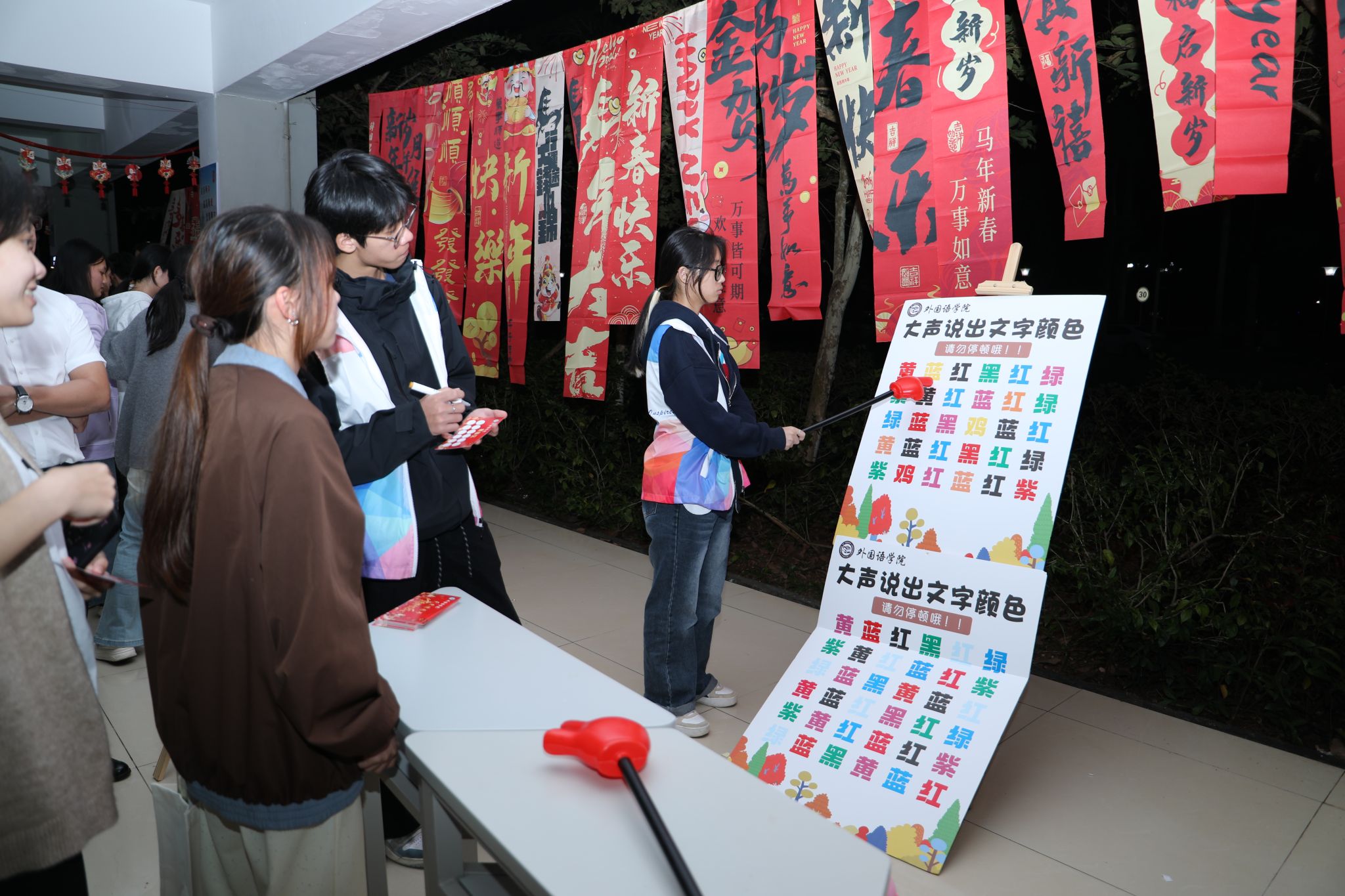 各二级学院还分别设置了各自的分会场,金珠大作战、蒙眼击鼓、你画我猜、漆扇制作、丢沙包、套圈……青春的活力与团聚的温暖在冬夜的校园里流动、汇聚。
