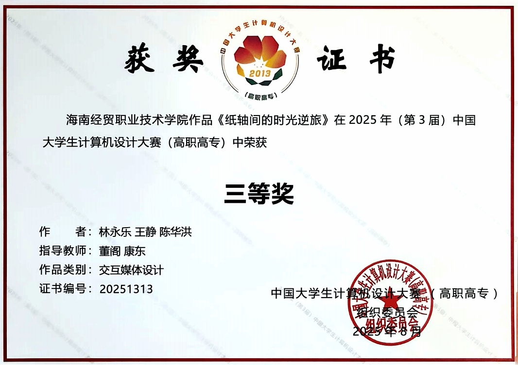 学生李开玲团队作品《千年奇迹-都江堰》、李毅捷团队作品《慧芯农田》荣获二等奖;林永乐团队作品《纸轴间的时光逆旅》、陆思凝团队作品《礼乐·编钟》荣获三等奖。