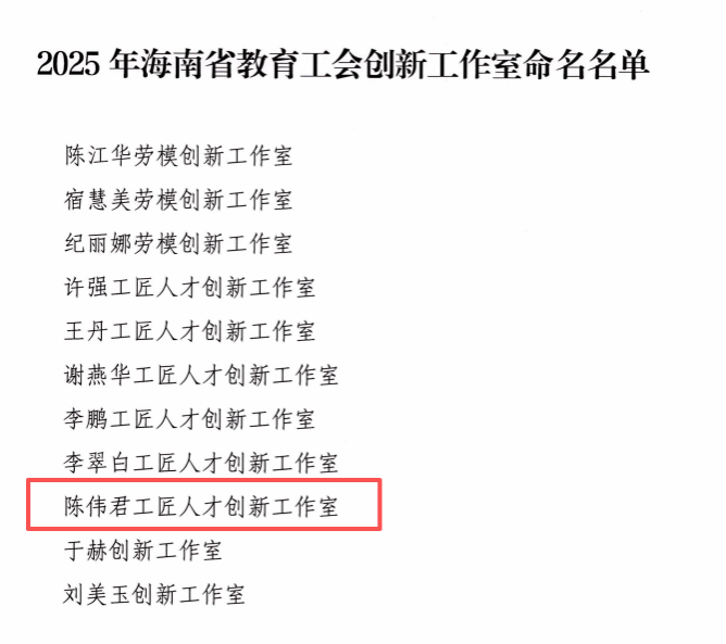 近日,海南省教育工会公布2025年省教育工会创新工作室命名结果,beat365英国官网网站陈伟君工匠人才创新工作室被命名为“海南省教育工会劳模与工匠人才创新工作室”。