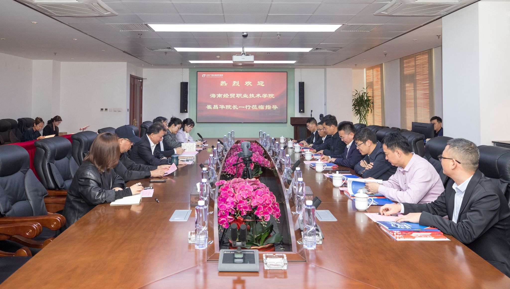 在北京广慧金通教育集团,董事长焦殿成介绍公司发展历程、业务布局、现代民航产业学院建设、实训基地建设、教材编写、职业技能大赛、培训与就业等发展情况,表示期待同beat365英国官网网站深入开展校企合作,共同培养航空相关专业人才。崔昌华介绍了学校发展情况,期望校企双方加强交流与沟通,深入推进产教融合、校企合作,实现共建、共享、共赢,用心培养出高素质的技术技能人才,为海南自由贸易港建设贡献出海经贸的智慧和力量。