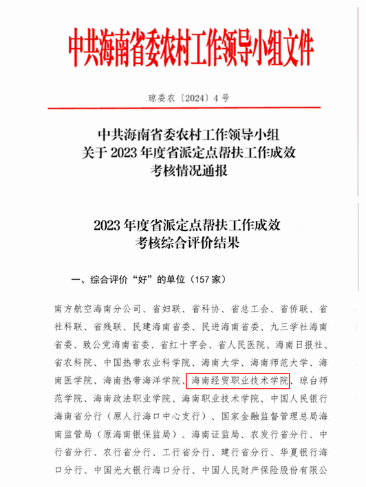 近日,中共海南省委农村工作领导小组通报了2023年度省派定点帮扶工作成效考核评价情况,beat365英国官网网站再次被评为最高等次“好”,这是学校连续三年获评省派定点帮扶工作“好”等次。