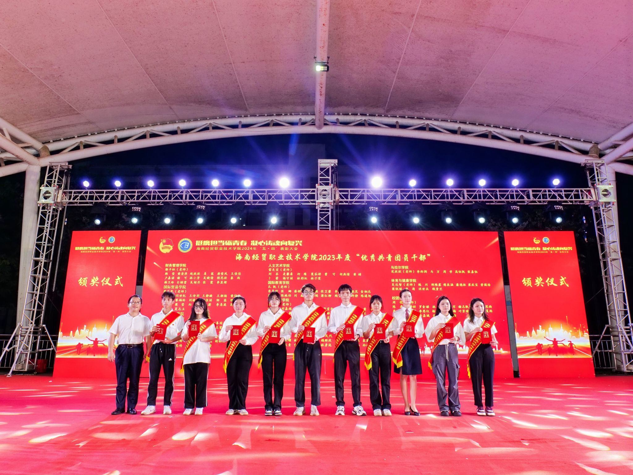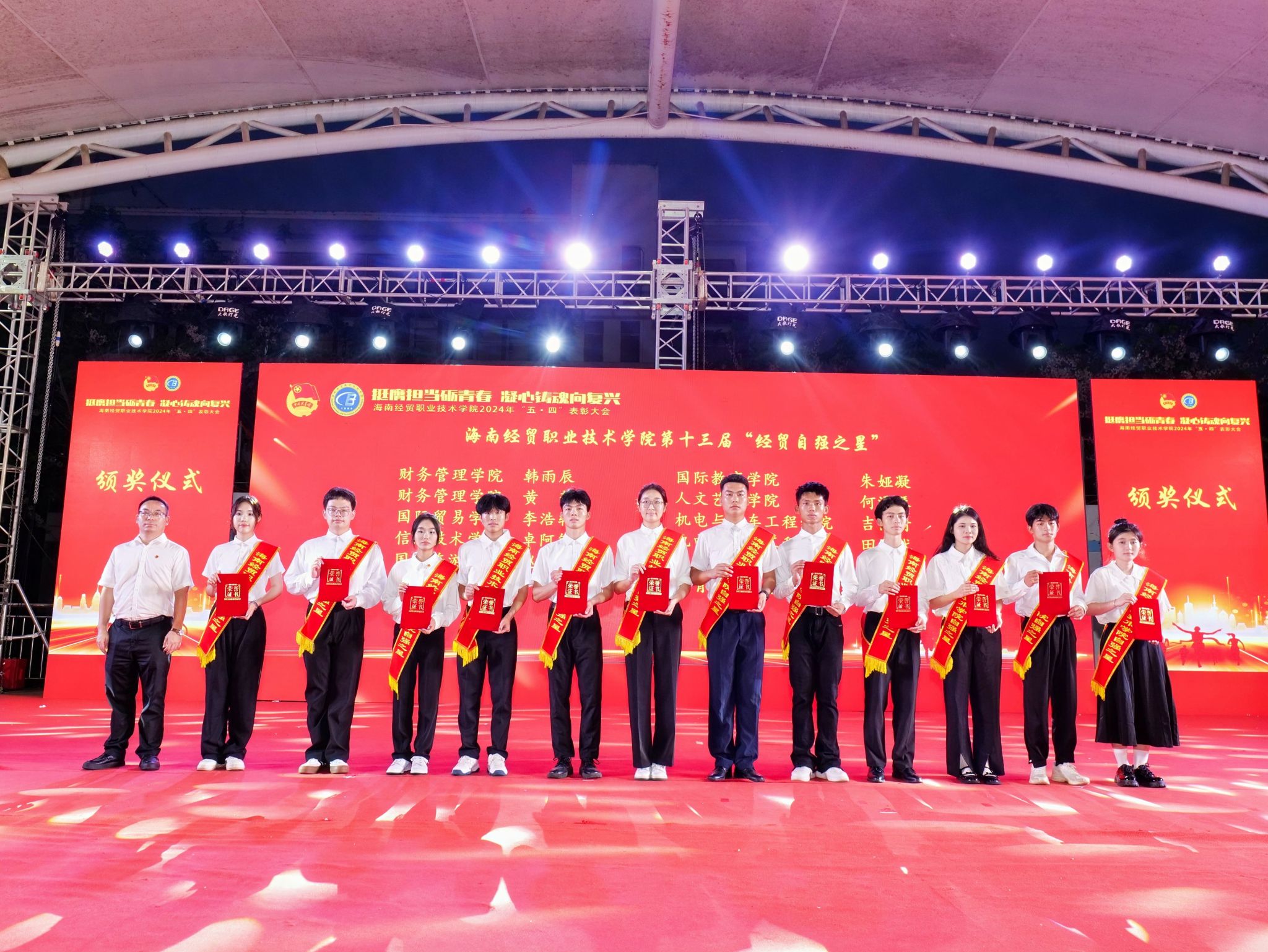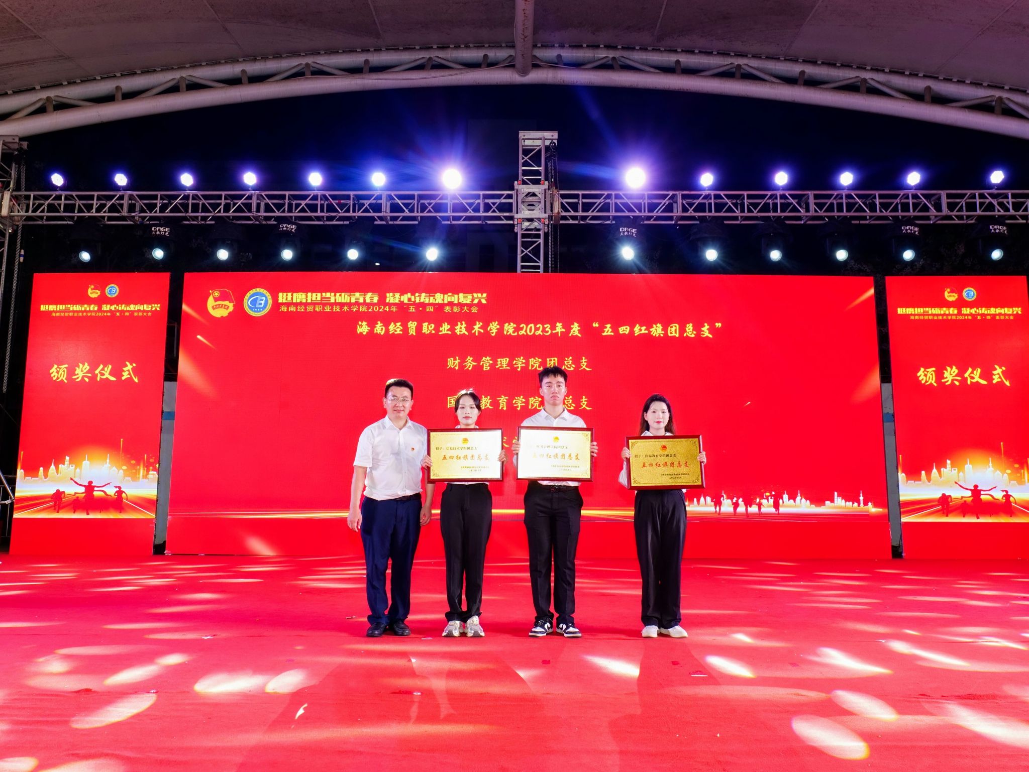 大会对获奖个人和集体进行表彰。李泽铖等3名同学荣获“经贸自强之星标兵”,韩雨辰等12名同学荣获“经贸自强之星”,财务管理学院、国际教育学院、信息技术学院等3个集体荣获“五四红旗团总支”,2022级大数据与财务管理(3+2)本科1班团支部等33个集体荣获“五四红旗团支部”,鄢平牡等10名教师荣获“优秀共青团干部”,韩莹等186名同学荣获“优秀共青团干部”,胡向雨等257名同学荣获“优秀共青团员”。