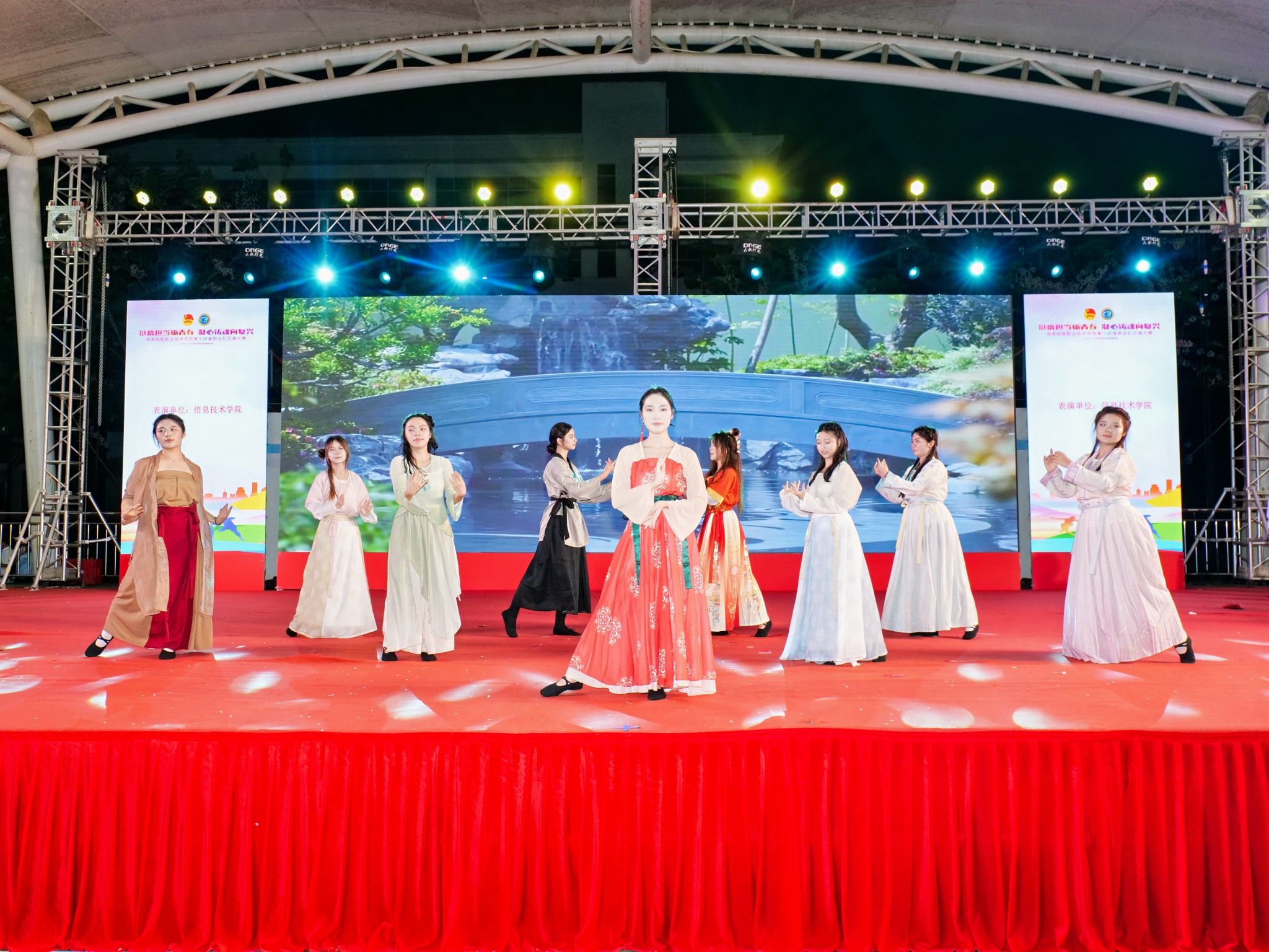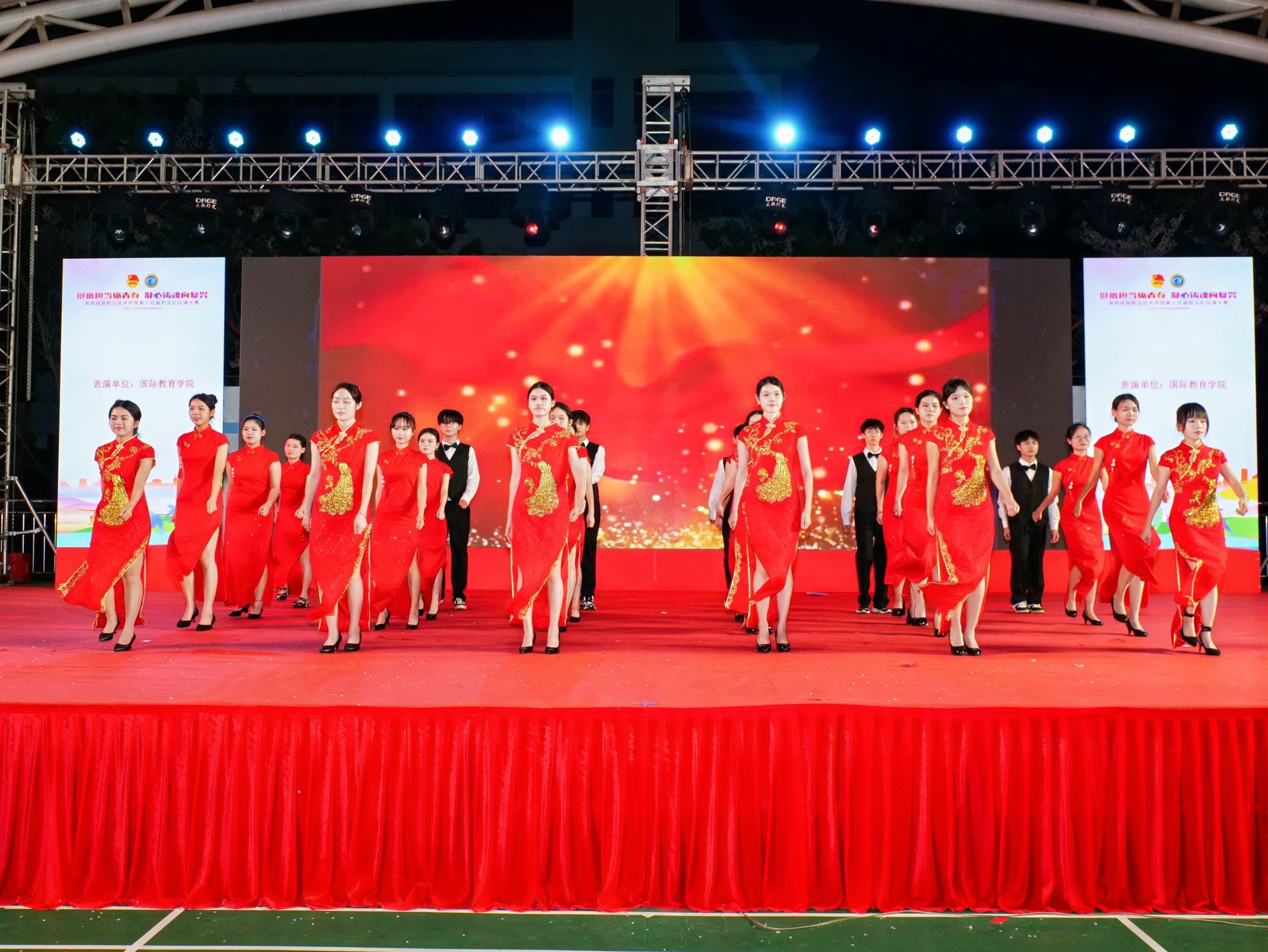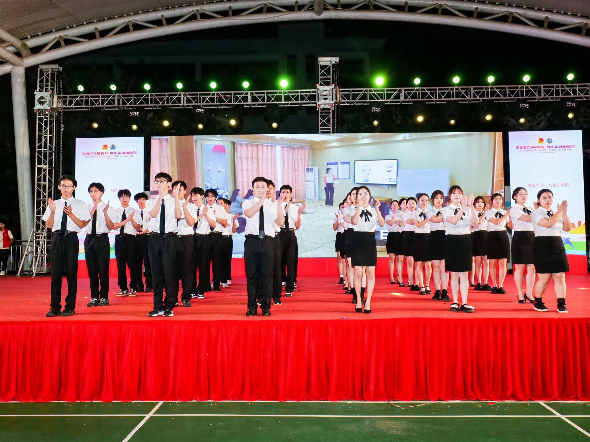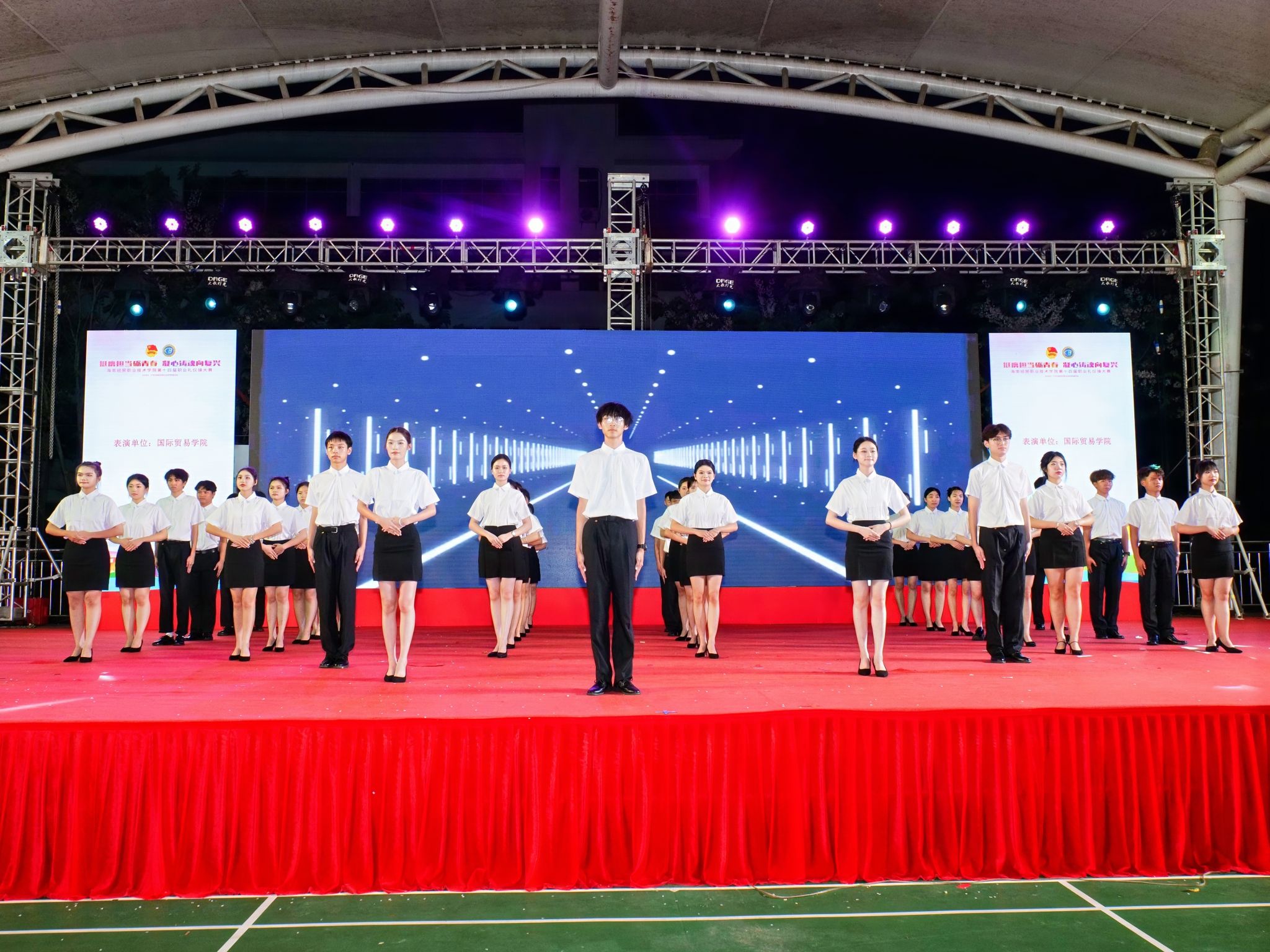 在第十四届职业礼仪操比赛中,来自二级学院的9支参赛队伍为现场观众带来了一场视觉盛宴。比赛分为职业礼仪操展示和创新表演两部分。各参赛队着装整齐,伴随着动感的音乐节奏,将日常的迎、送、站、坐、行、蹲、递、接等礼仪规范化为优雅的礼仪操动作,将专业技能、职业场景和舞蹈器乐等中华优秀传统文化融入礼仪操创新展示当中,展现出海经贸学子青春昂扬的精神面貌。