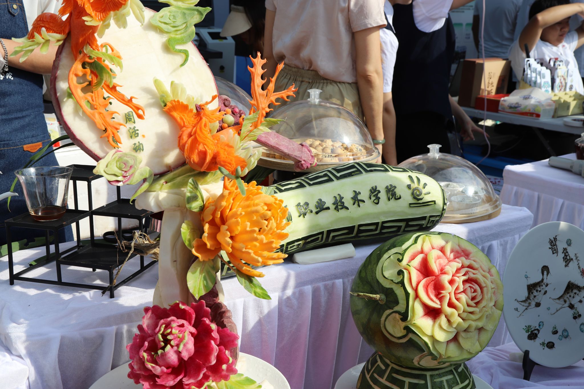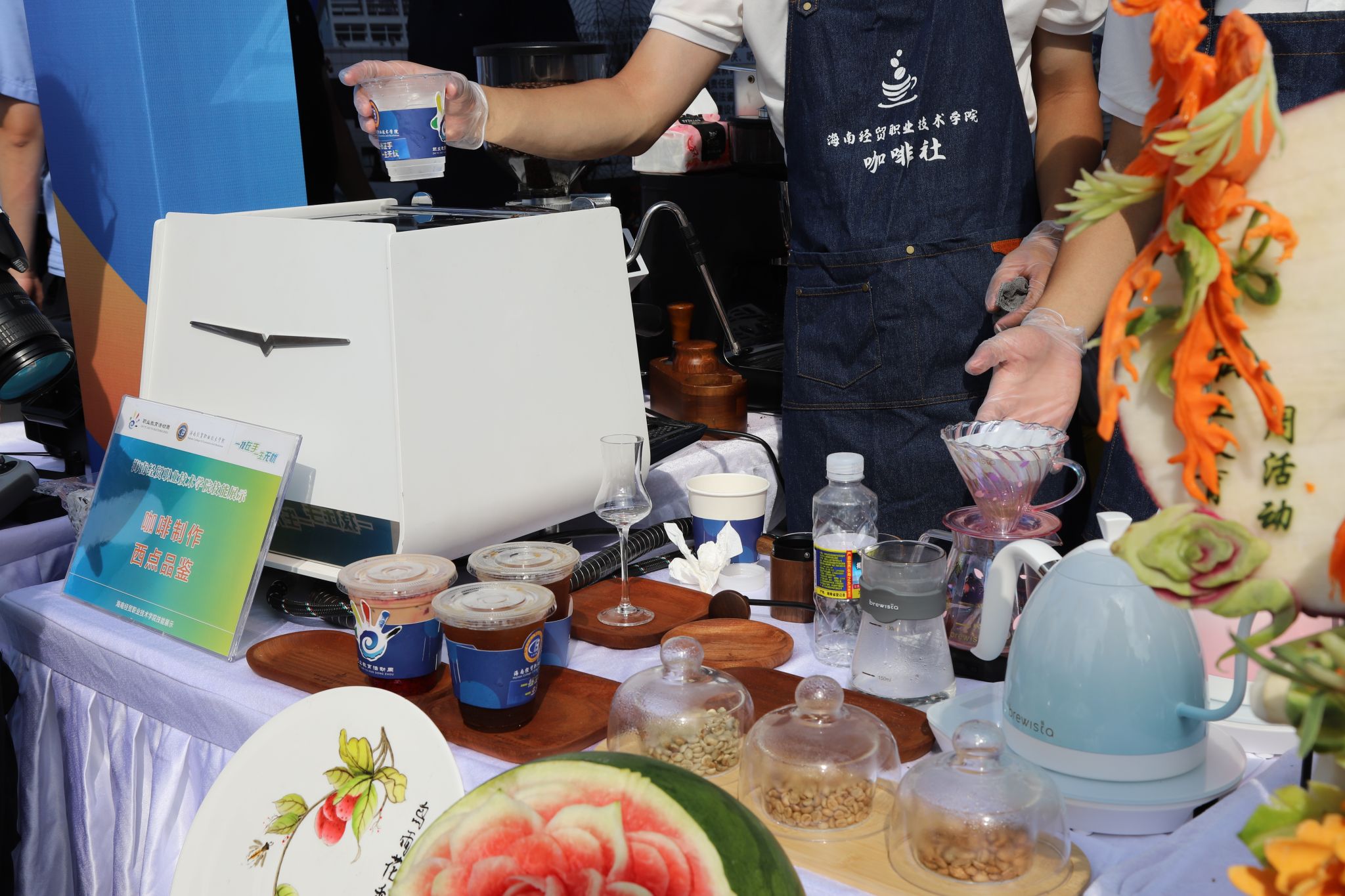“西瓜雕出了牡丹花,手艺够好的呀!”在旅游消费休闲体验展位,热带风情西点饮品和精美的雕刻作品成为了全场焦点。刘嘉燕等同学制作的斑斓生椰拿铁、椰香斑斓卷、核桃酥等食品和饮品,在炎炎夏日带来了沁人心脾的清凉,让市民朋友们赞不绝口。