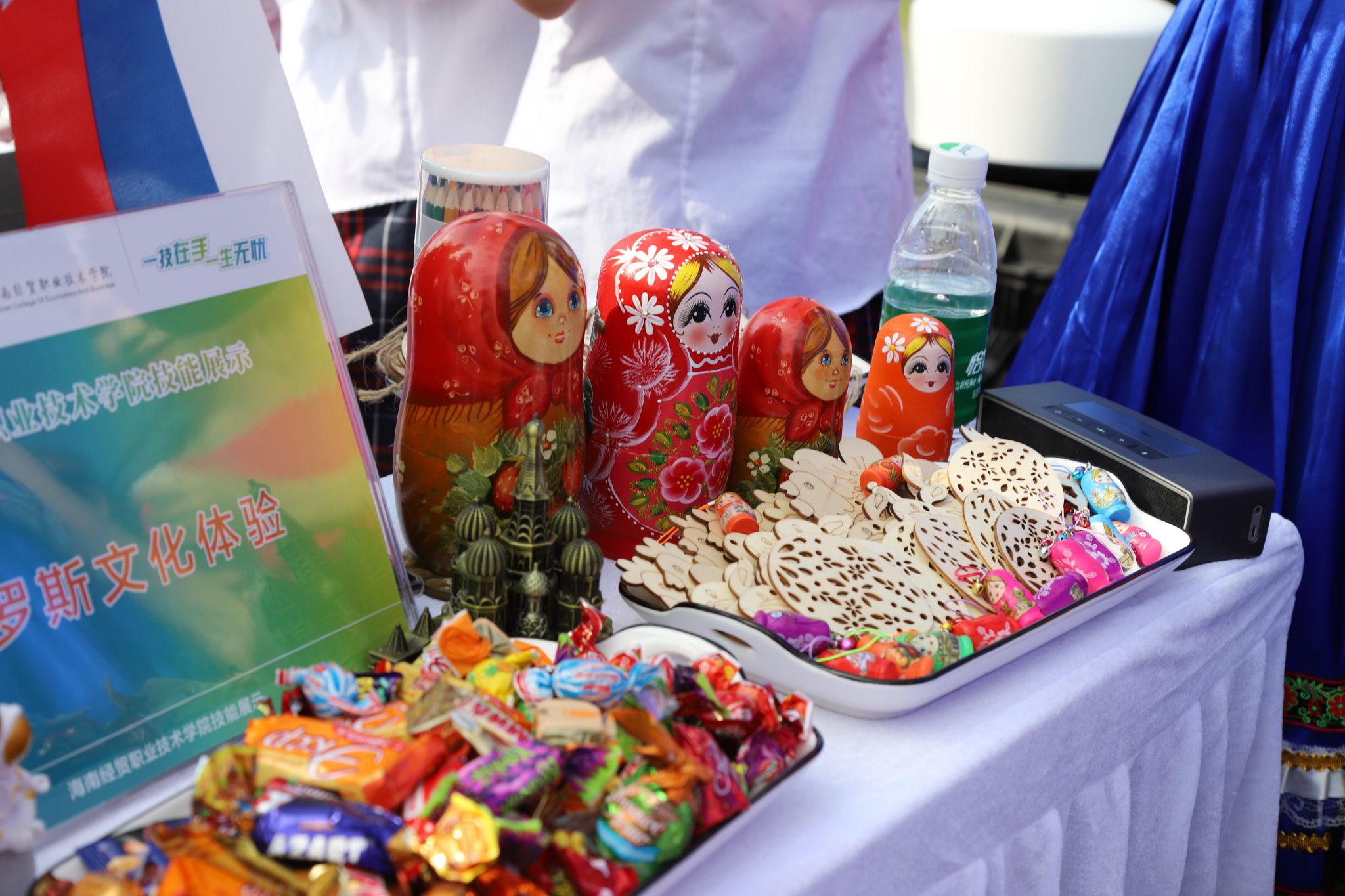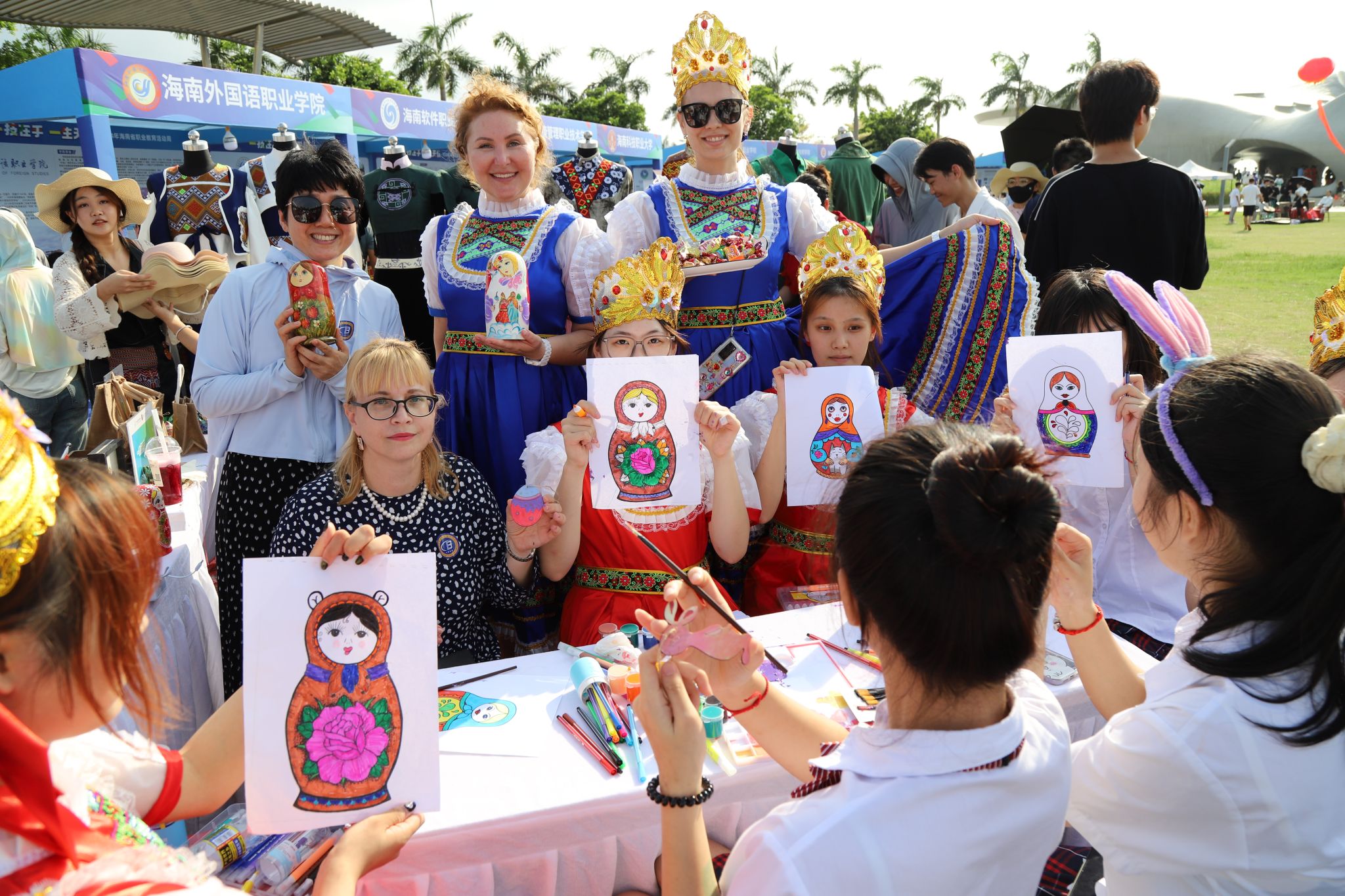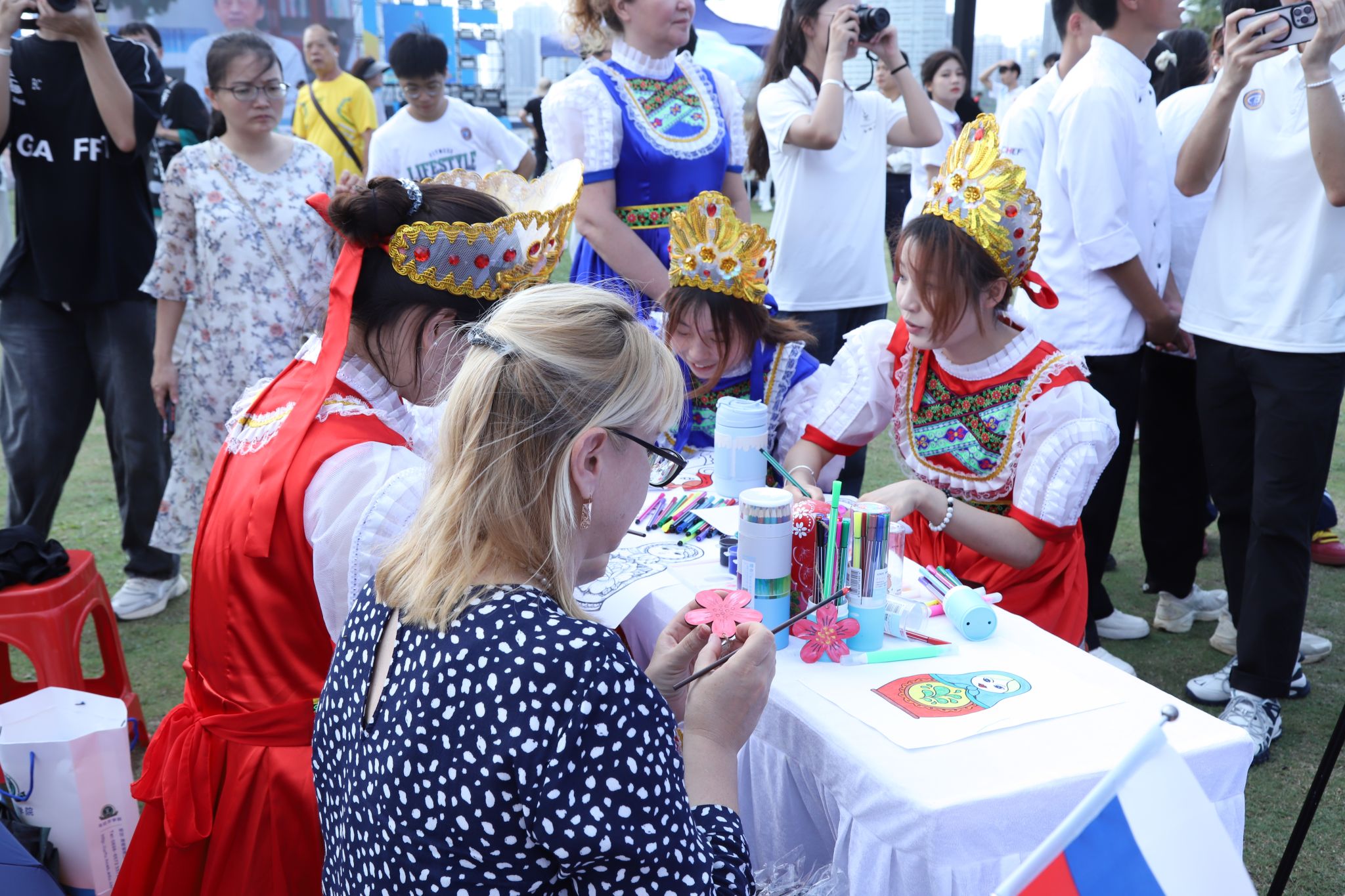 在国际文化交流与体验展位,俄罗斯套娃和工艺品木雕片现场手绘活动备受市民欢迎。乌拉尔学院师生们穿着俄罗斯传统服装,桌上摆着香甜的俄罗斯巧克力糖果和精美可爱的俄罗斯套娃。外教达利娅和伊莉娜也来到展位,教市民朋友们“你好”“谢谢”等俄语,与大家玩起了俄罗斯民间游戏,并欢迎同学们报考beat365英国官网网站。