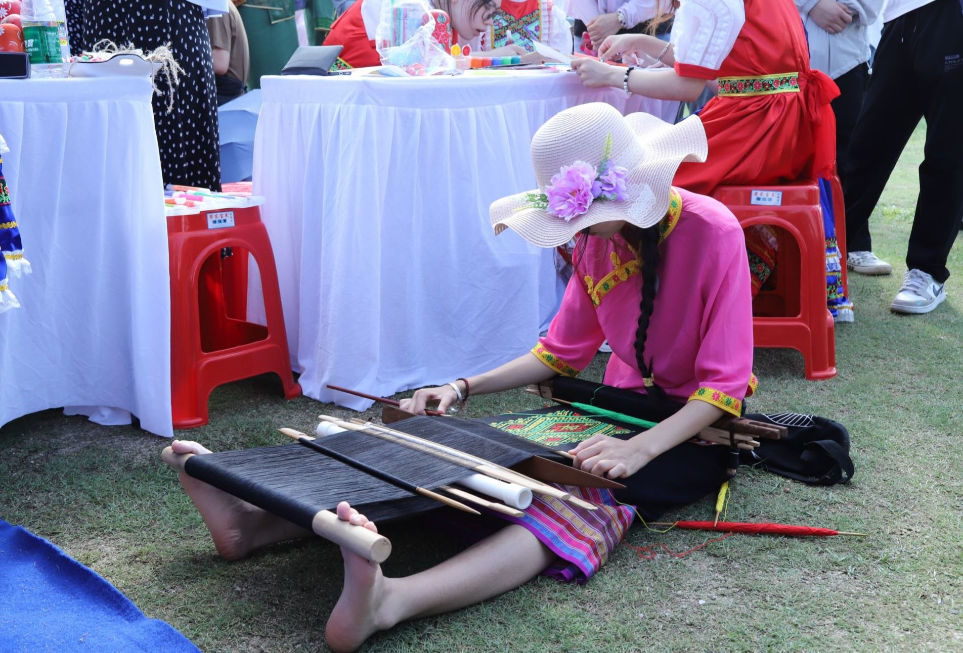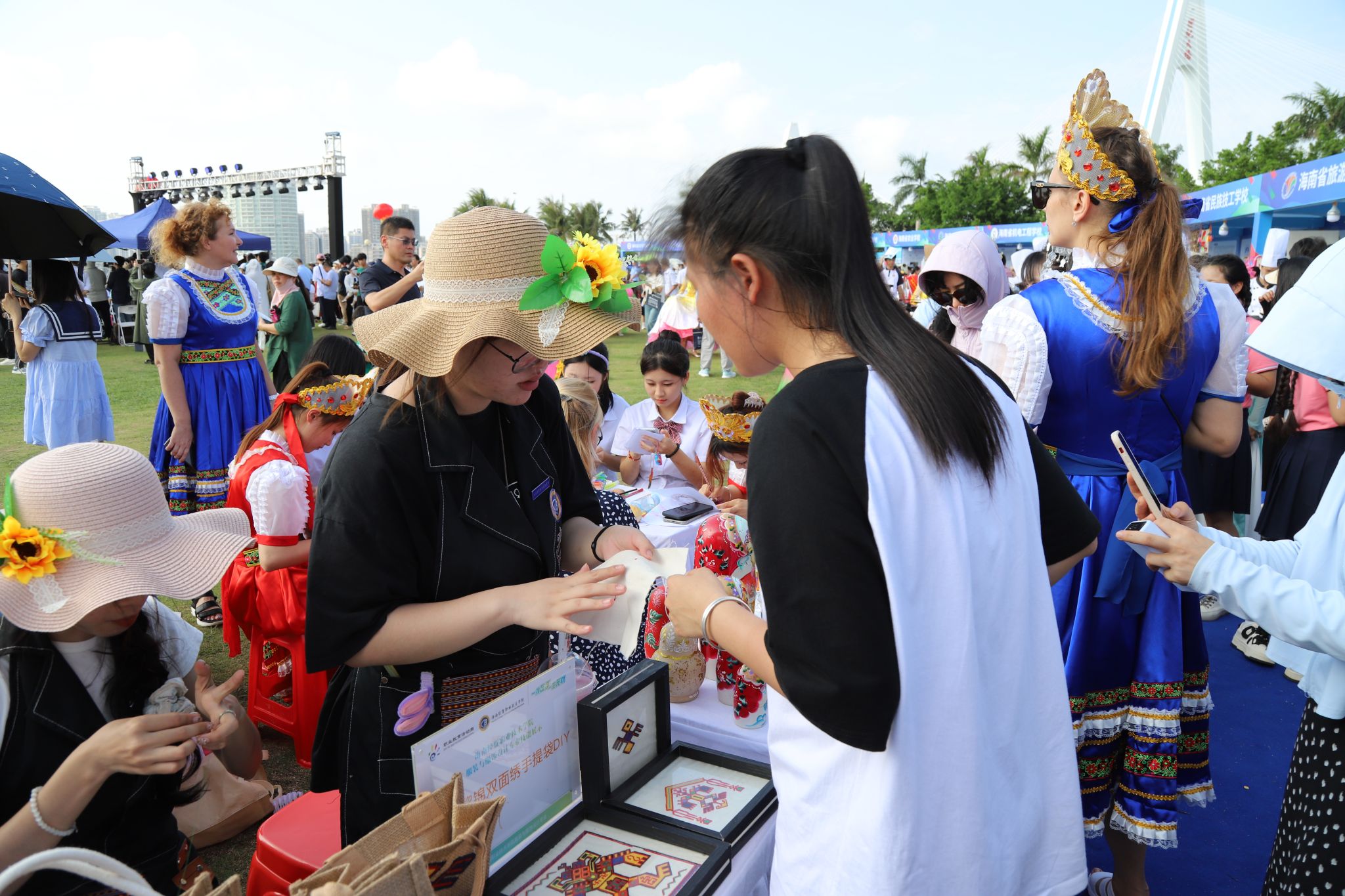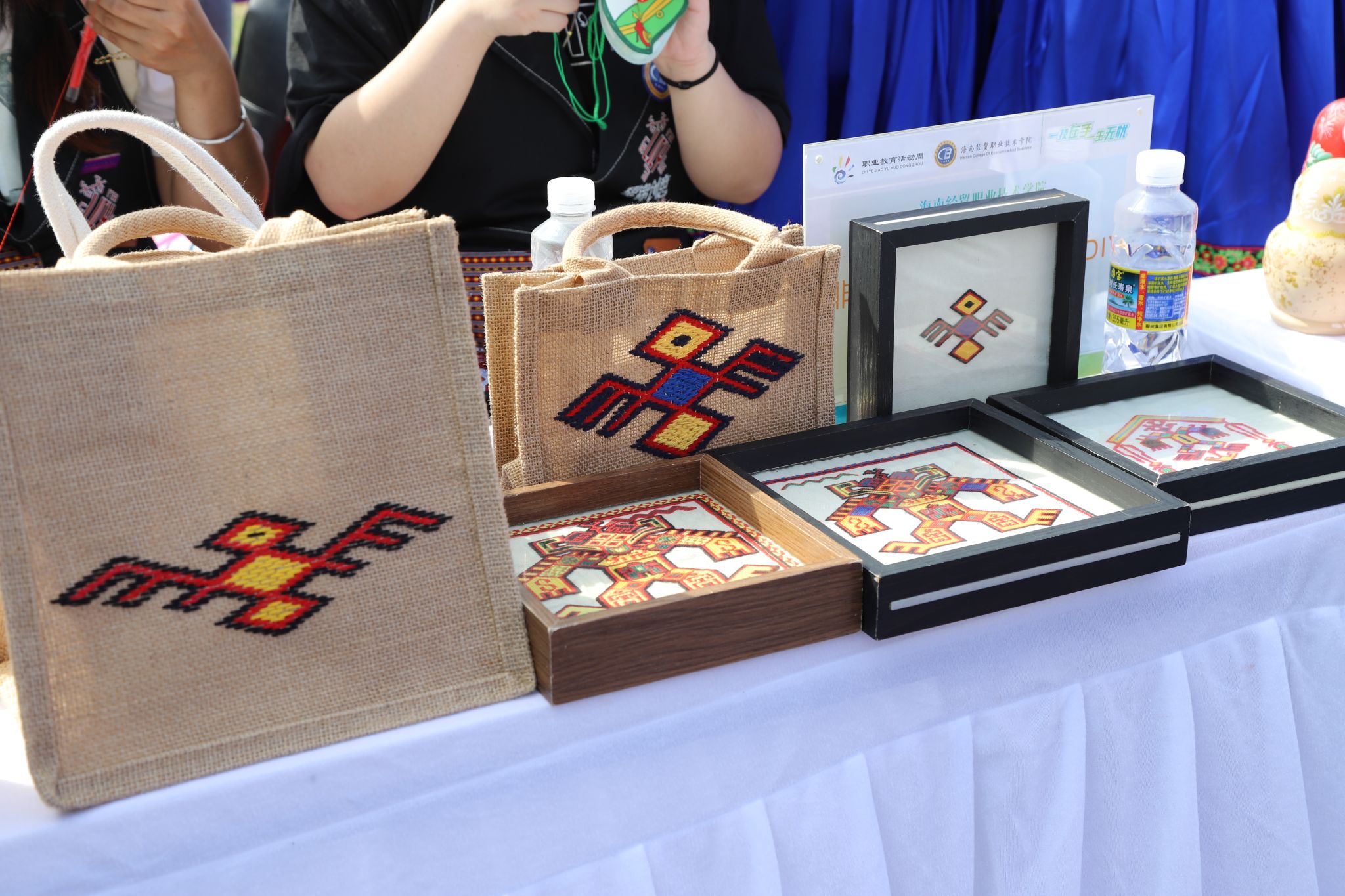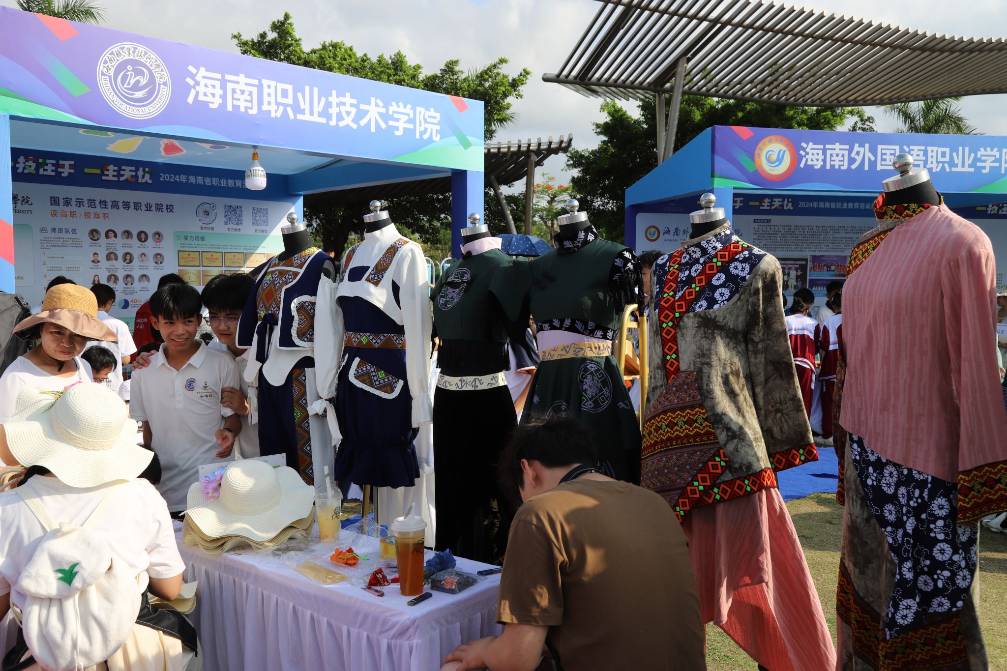 人文艺术学院何一秀同学精心缝制着端午节香囊,桌面上放置着草帽、端午节编织手链等传统民俗装饰品。程嘉乐、潘晓霞同学分别在服装印花机器和电脑前操作,制作出一件件印有黎族图腾纹样的T恤衫。“我们想宣传海南黎族文化,让更多年轻人了解、喜爱、传承。”优秀毕业生的黎族传统服装设计作品和黎族织锦技艺展示更是吸引了市民朋友们的目光,大家纷纷为创意作品和制作工艺点赞。