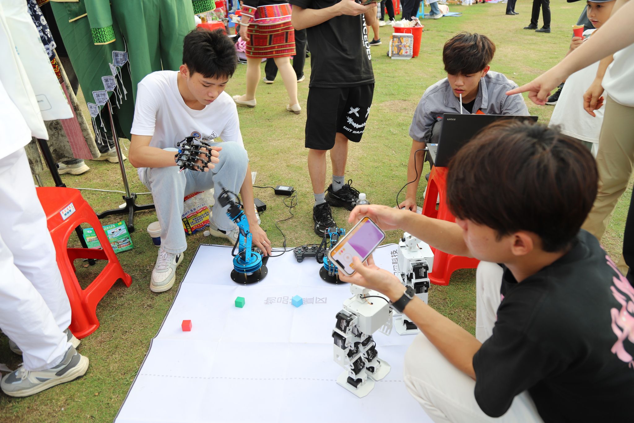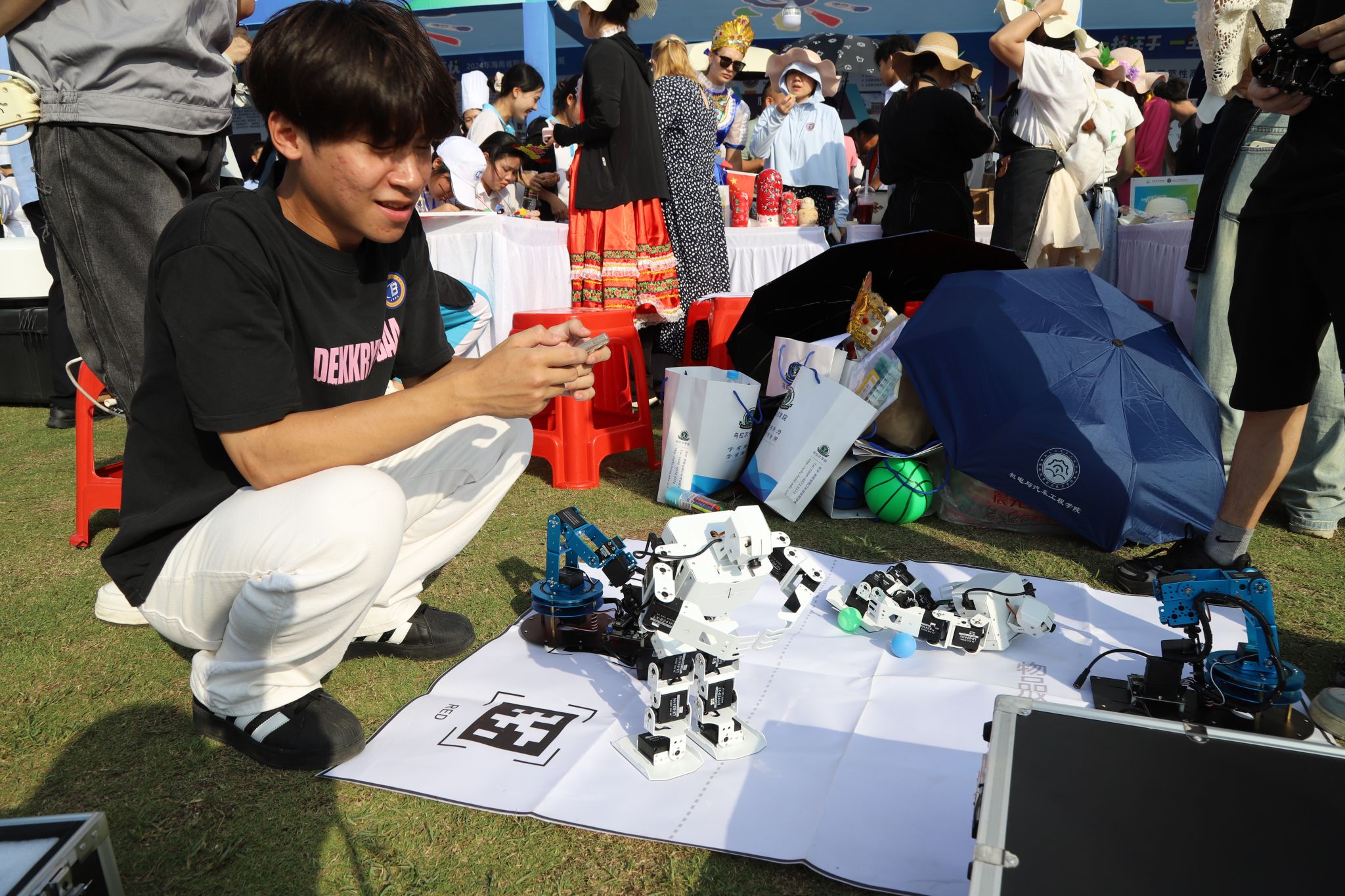 “看,这个机器人会跳舞!”来到智能机器人应用展示项目展位,机电与汽车工程学院刘麦老师介绍说,通过软件编程,人形机器人可以完成自动踢球、颜色识别、智能巡线等指令,机械臂能够实现体感控制、分拣物品等操作。掌握这些技术的同学们未来可以为智慧城市、智能家居、数字化工厂、智慧农业等领域提供技术支持,就业前景广阔。