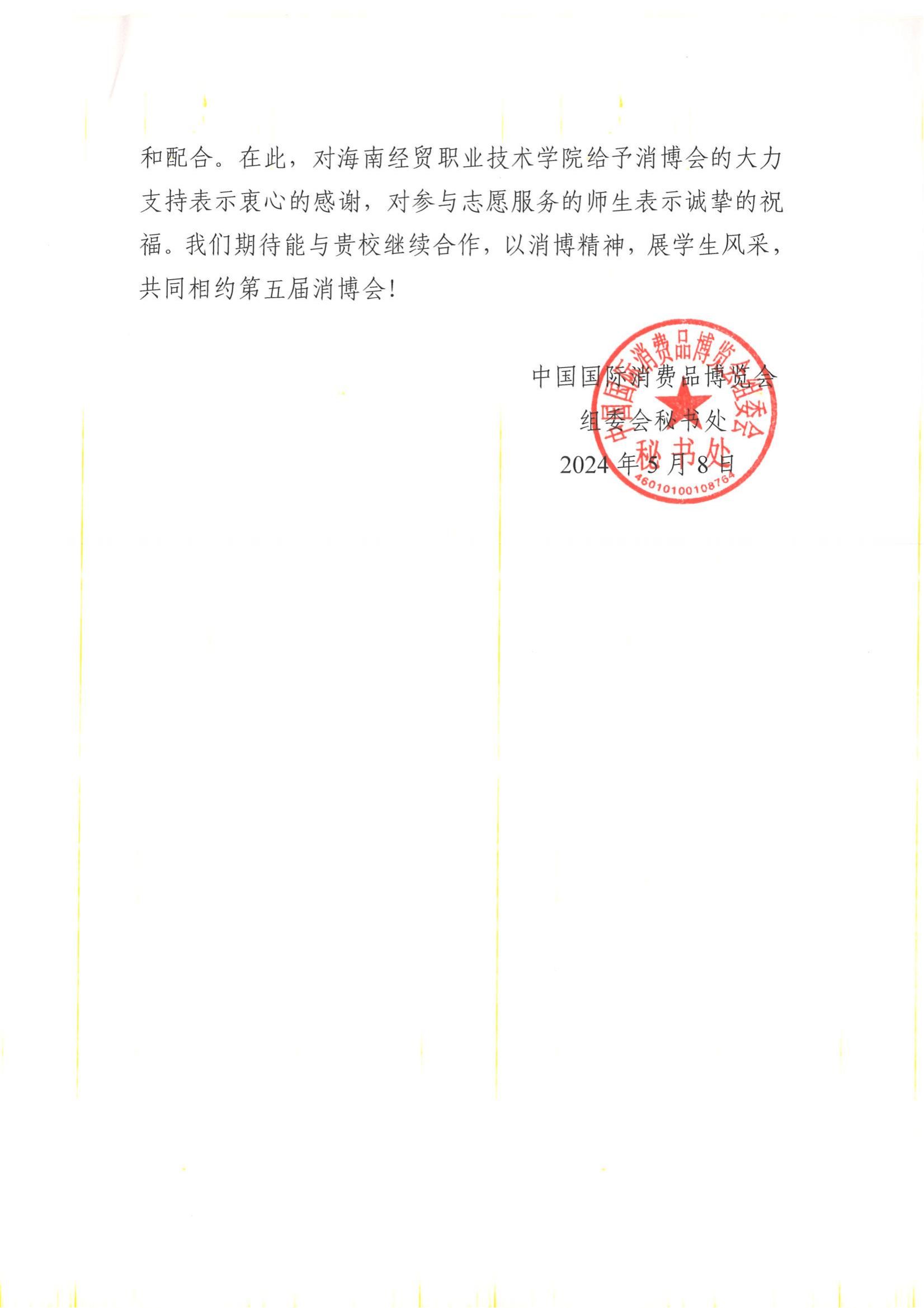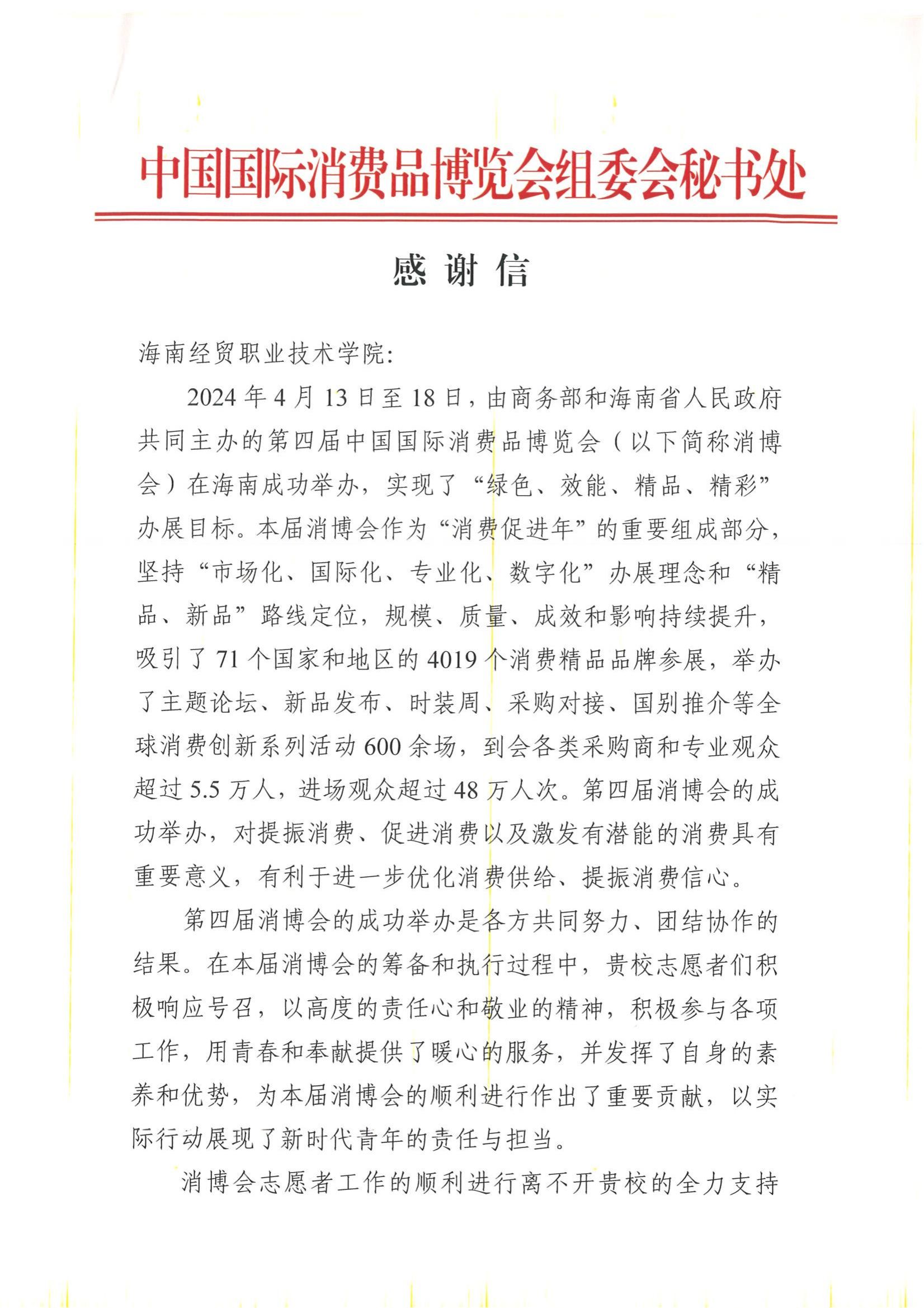 近日,中国国际消费品博览会组委会秘书处向beat365英国官网网站发来感谢信,对学校师生积极参与第四届消博会志愿服务工作给予高度评价,向学校的大力支持表示感谢并致以敬意。