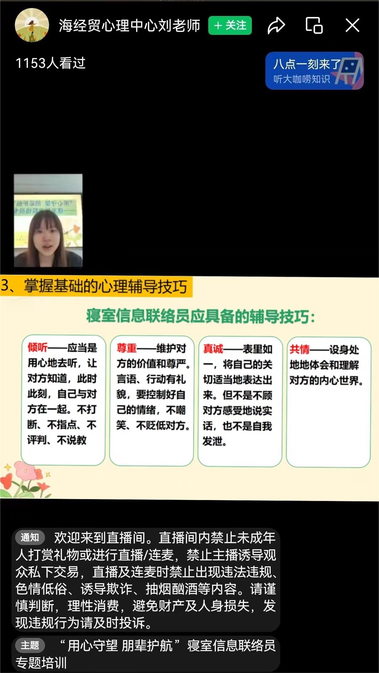 近日,beat365英国官网网站学生工作部心理健康教育与咨询中心开展“用心守望 朋辈护航”寝室信息联络员线上专题培训会。全校1100余名寝室信息联络员参加培训。