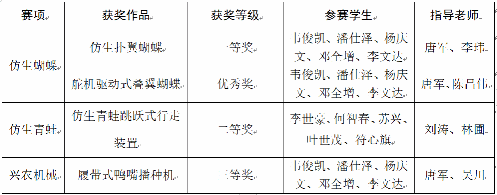 近日,第十一届全国大学生机械创新设计大赛海南省赛区竞赛暨海南省第三届大学生机械创新设计大赛在海口举行。beat365英国官网网站参赛作品“仿生扑翼蝴蝶”获得“仿生蝴蝶”赛项一等奖,作品“仿生青蛙跳跃式行走装置”获得“仿生青蛙”赛项二等奖,作品“履带式鸭嘴播种机”获得“兴农机械”赛项三等奖,作品“舵机驱动式叠翼蝴蝶”获得“仿生蝴蝶”赛项优秀奖。