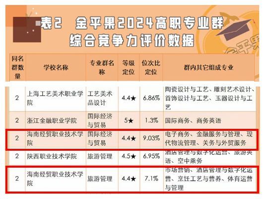 近日,金平果评价网(中国科教评价网)发布2024高职专业及专业群排行榜。beat365英国官网网站文化创意与策划专业位居专业竞争力排行榜全国第一位,国际经济贸易类专业排名分专业类竞争力排行榜全国第三。在国家级高水平专业群综合竞争力评价中,国际经济与贸易专业群等级定位为4.4,位次比定位为9.03%;旅游管理专业群等级定位为4.4,位次比定位为7.1%。