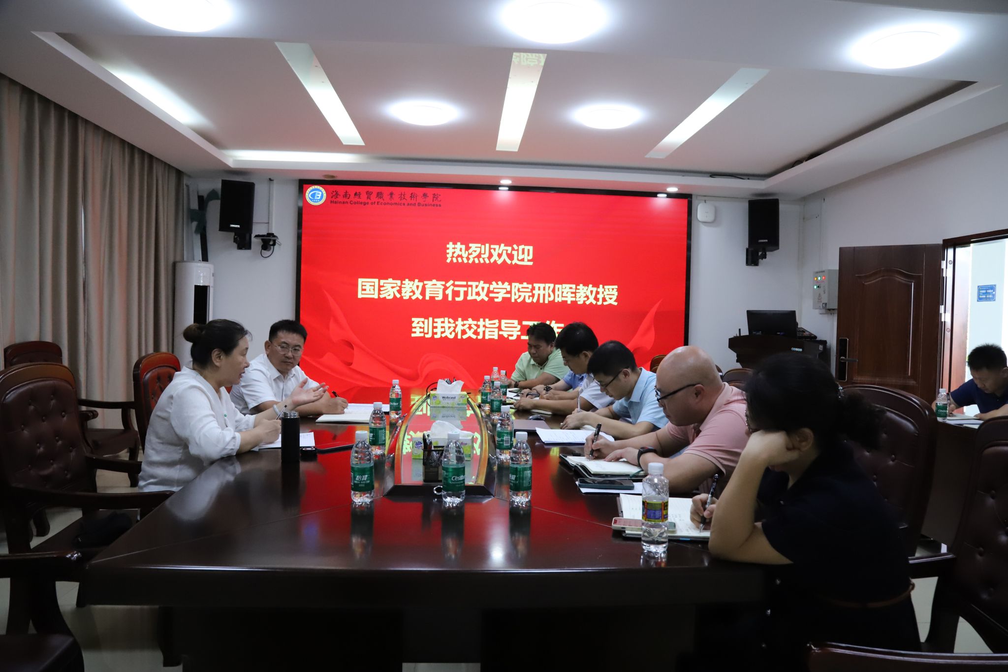 邢晖听取学校关于申办本科职业大学、“双高”建设相关工作介绍,同与会人员进行了深入交流。她说,学校要紧跟国家职教改革步伐,全面吃透有关政策精神,紧密结合海南自由贸易港建设的优势和学校实际,积极主动作为,加快推进各项工作有序有效落实。