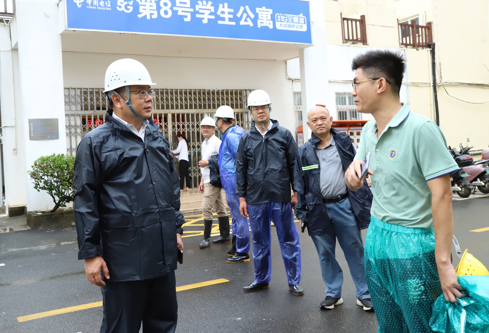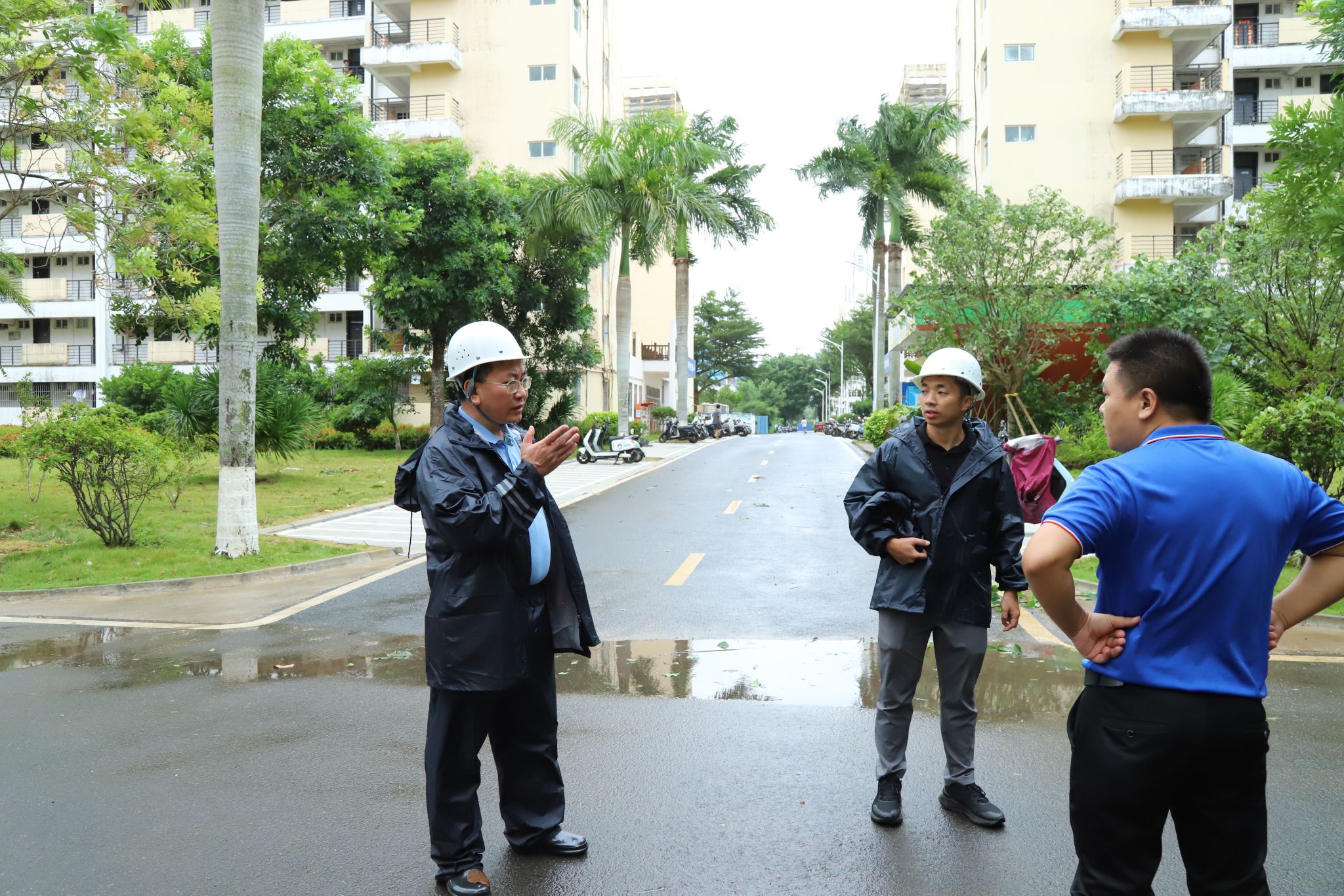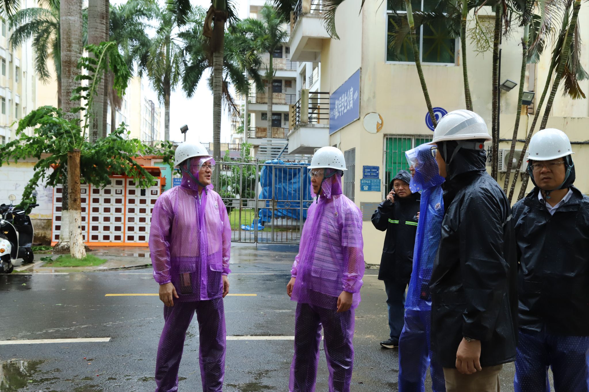 9月6日上午,受2024年第11号台风“摩羯”的影响,海口地区风雨逐渐加大。beat365英国官网网站党委书记王华,党委副书记、校长崔昌华,党委委员、副校长陈修焕,党委委员、纪委书记、监察专员符史杭,党委委员、副校长刘文斌等校领导再次分头来到学生宿舍、学生食堂,检查指导防风防汛工作。
