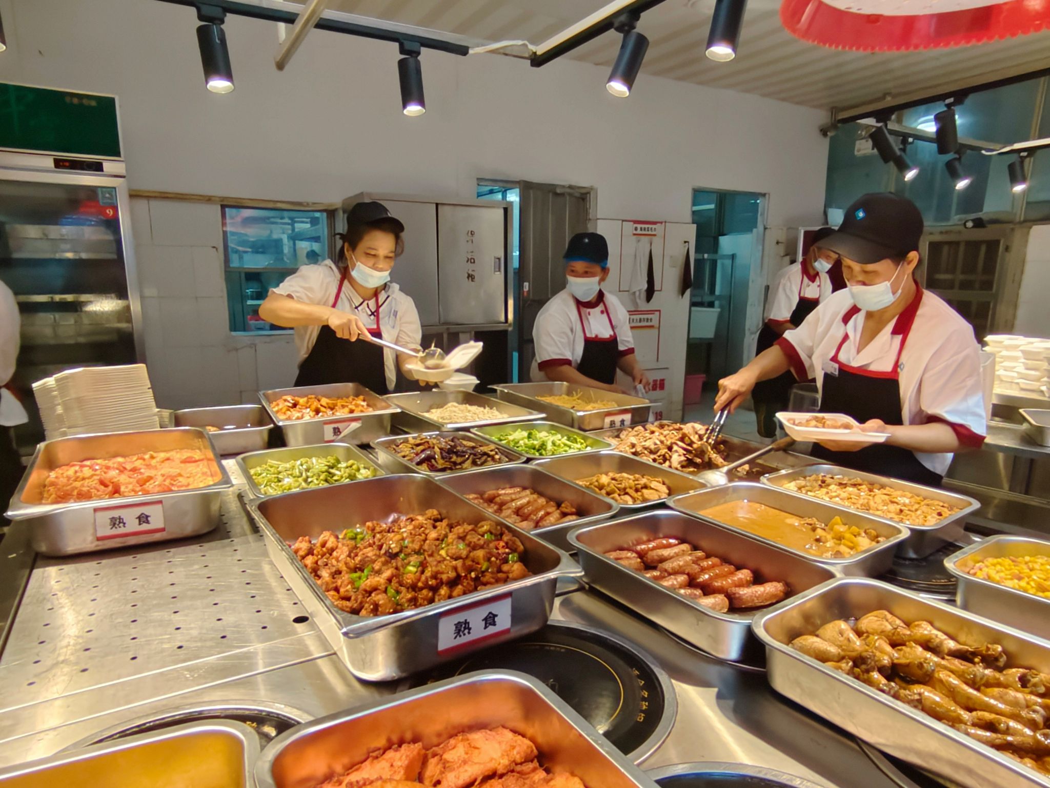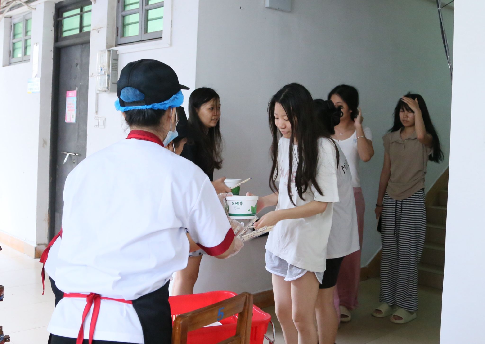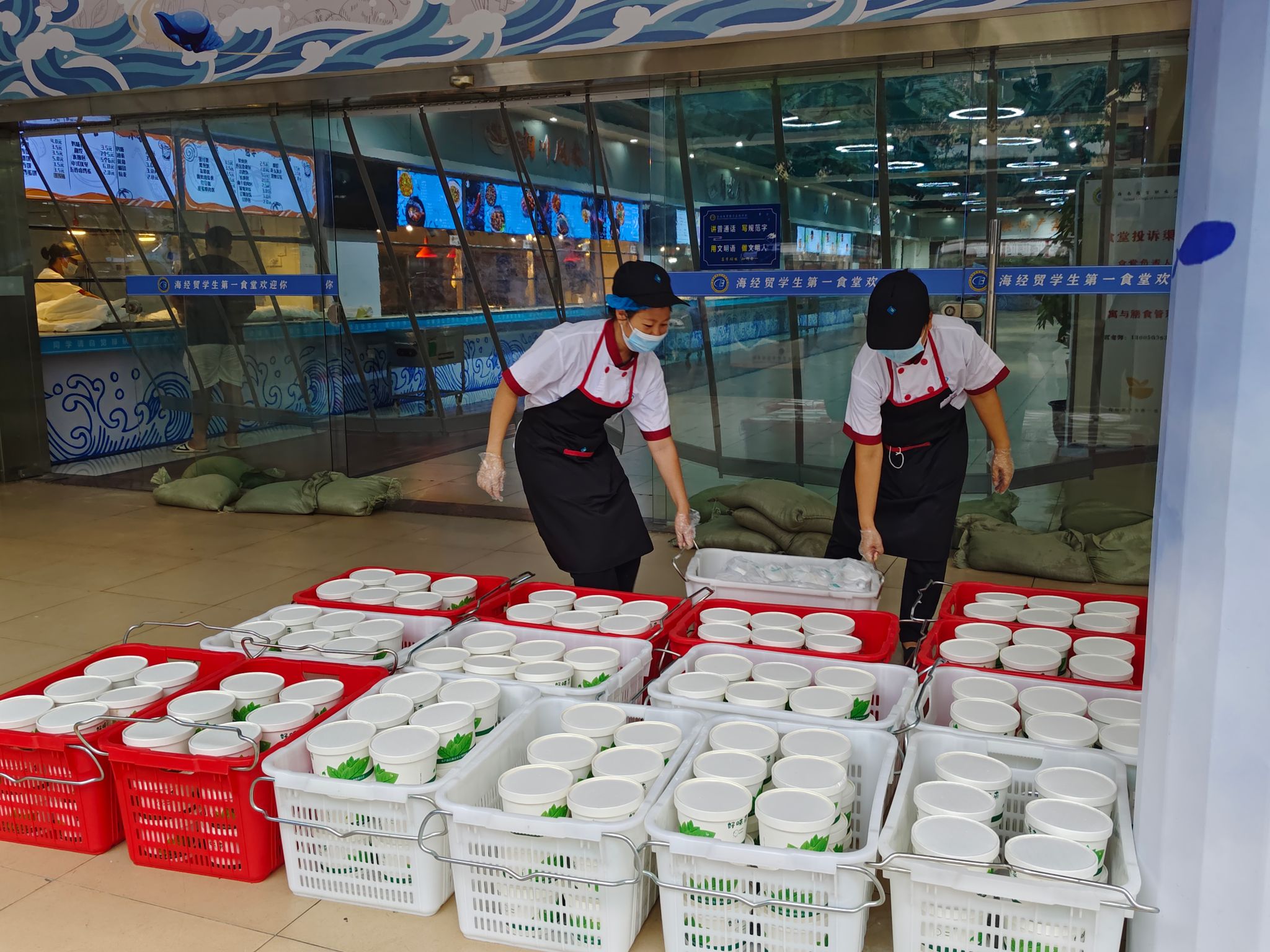 在食堂,工作人员正在热火朝天地忙碌着。为了做好6日的学生午餐供应,食堂提前制定应急预案,协调供货商,多措并举备足食材。10时开始,食堂人员将饭菜装盒、打包、装箱,将一箱箱满载着套餐的保洁箱送到各个宿舍楼,让前来领取餐食的同学们暖胃又暖心。学校还为同学们准备了方便面,确保即使食堂因超强台风无法正常供餐,同学们也能应紧的食物。