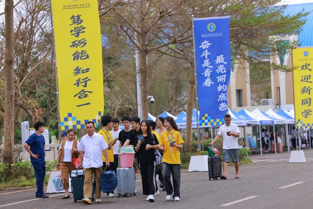 在新生报到前夕,海南遭受了超强台风“摩羯”的侵袭。海经贸师生守望相助、众志成城,经过连日紧张的灾后恢复重建,学校已恢复基本生活学习秩序。报到当天,秋风送爽,彩旗飘扬,迎新拱门焕新夺目,全校上下竭尽全力,共同为新生们营造温馨喜庆的氛围,提供细致入微的服务,确保每位新生都能顺利开启大学新篇章。