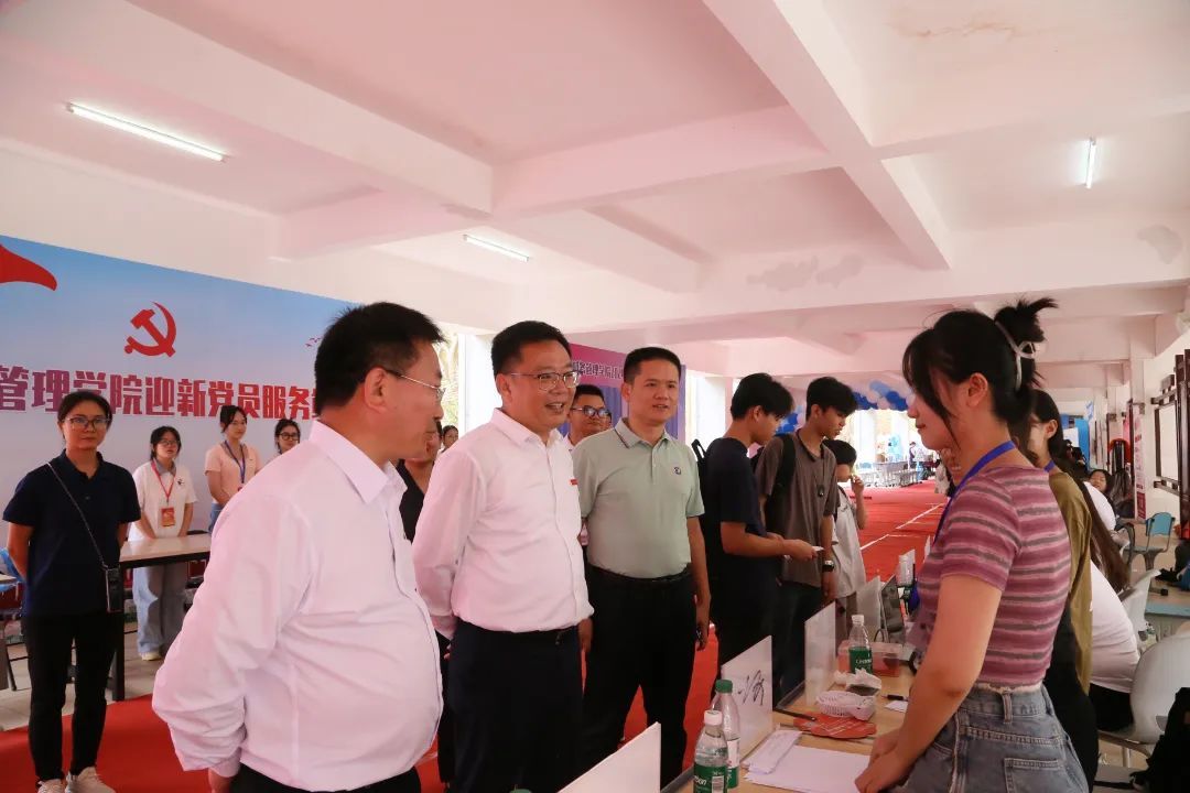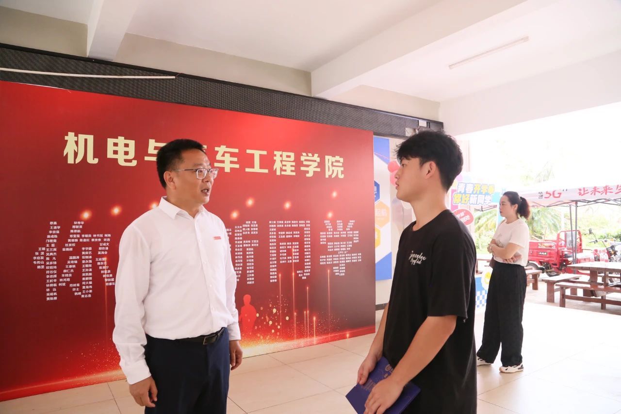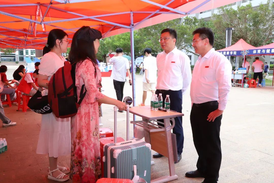 学校党委书记王华、校长崔昌华等校领导们来到新生报到处,看望师生志愿者。详细了解迎新工作开展情况,与新生和家长亲切交流,慰问迎新一线的师生员工和志愿者。“一路上你们辛苦了”“孩子来到海经贸您就放心吧”“学校还在继续灾后重建,希望你们一起加入”……校领导们感谢各位家长对学校的信任,欢迎各位同学成为海经贸大家庭的一员,勉励大家传承校训“笃学砺能、知行合一”,弘扬“脊梁精神”,迎接一个充实快乐的大学生活。