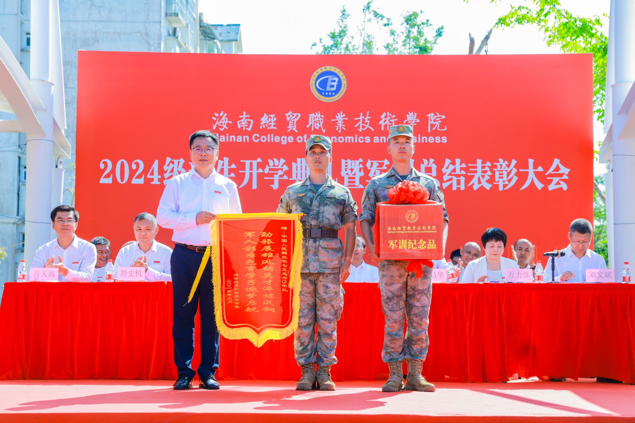 王华代表学校向承训单位赠送“劲旅展雄风铸英才淬炼成钢、军人彰本色育学子逐梦启航”锦旗,感谢教官们给予学生的军训帮扶、悉心指导和榜样示范。