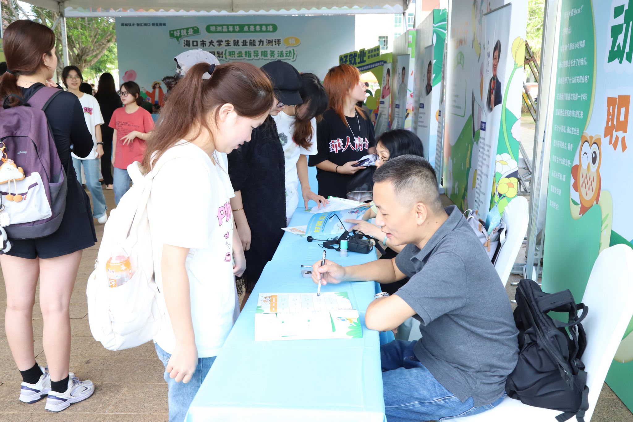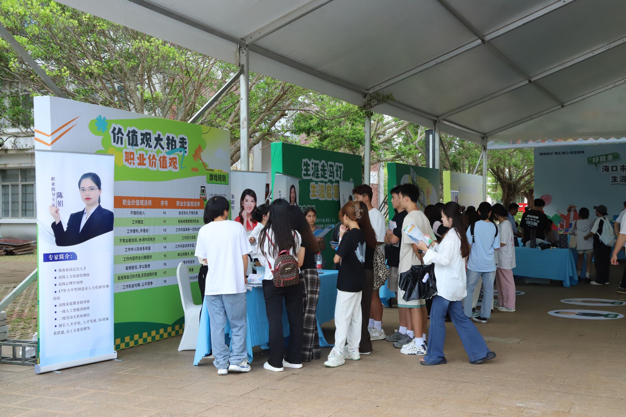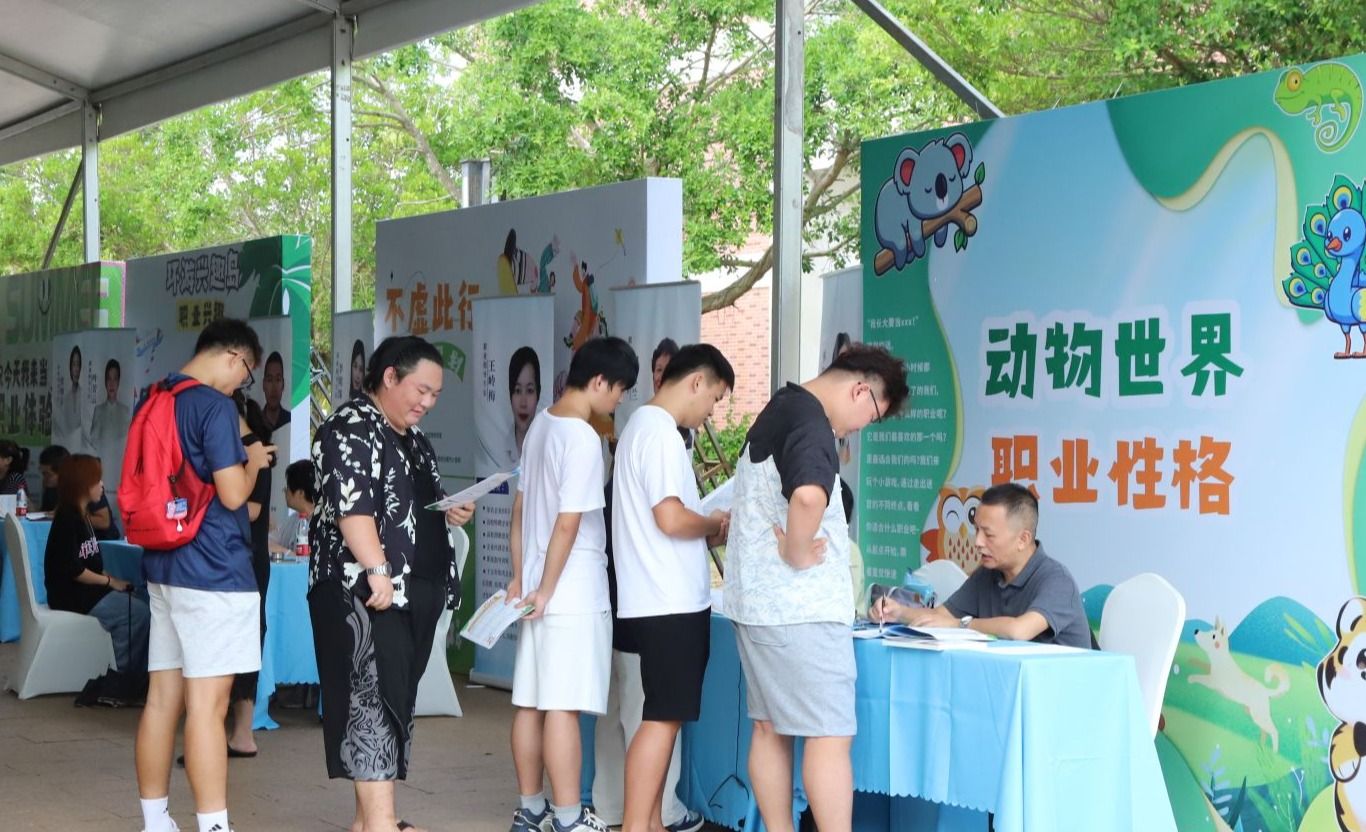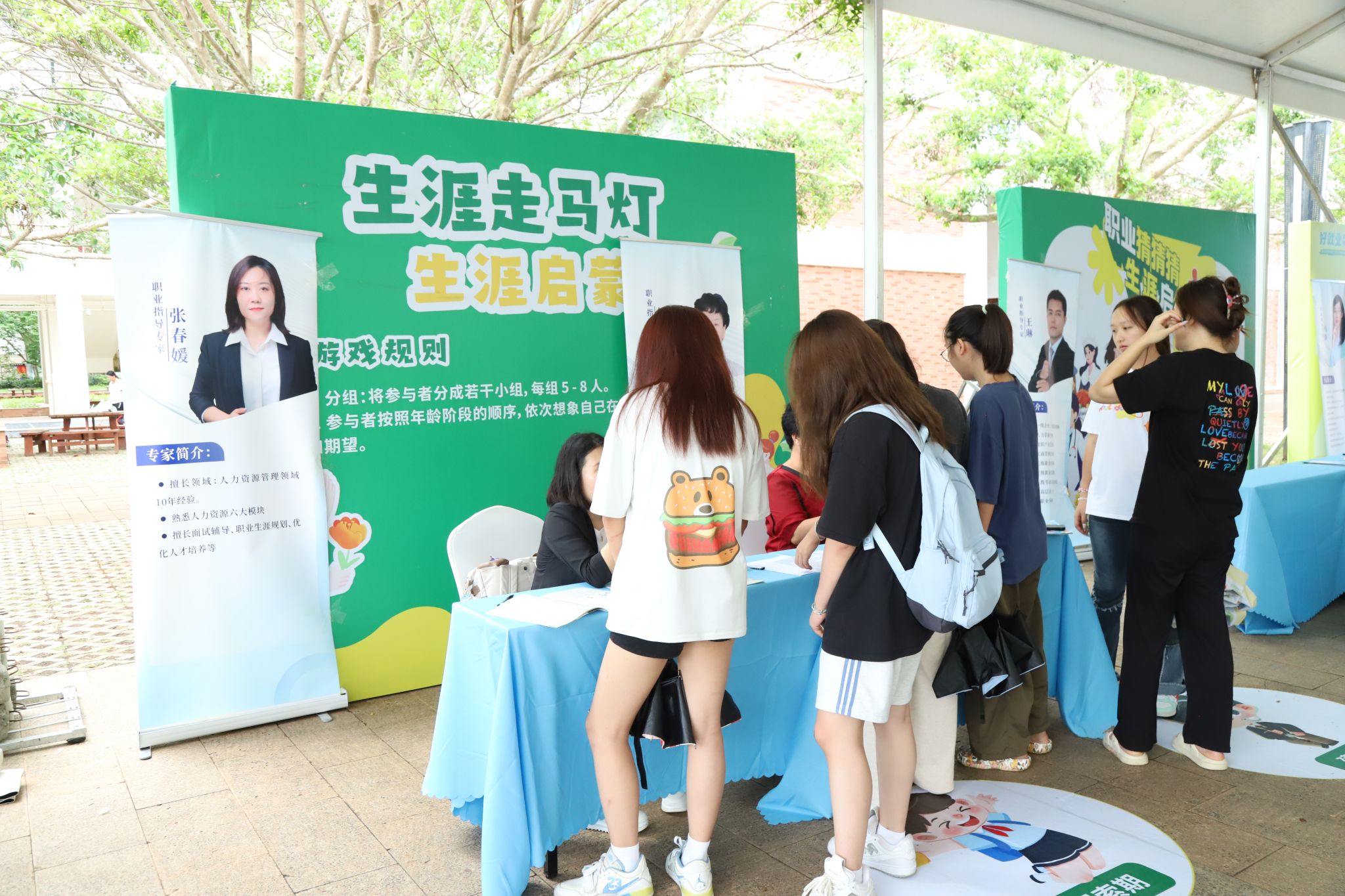 在经贸广场前,由中共海口市委人才发展局主办、beat365英国官网网站等单位承办的海口市大学生就业能力测评和生涯规划活动也在火热进行中。“生涯走马灯”“兴趣职业对对碰”“绘制我的职业蓝图”……前来参加招聘会的同学纷纷沉浸式参与互动体验,在活动中完成自我探索、职业目标探索和生涯愿景展望。充满趣味的测评活动帮助同学们梳理生涯规划思路,构建职业发展体系,明确自身需要提升的能力和素质,有针对性地进行学习和实践,从而提高就业竞争力。