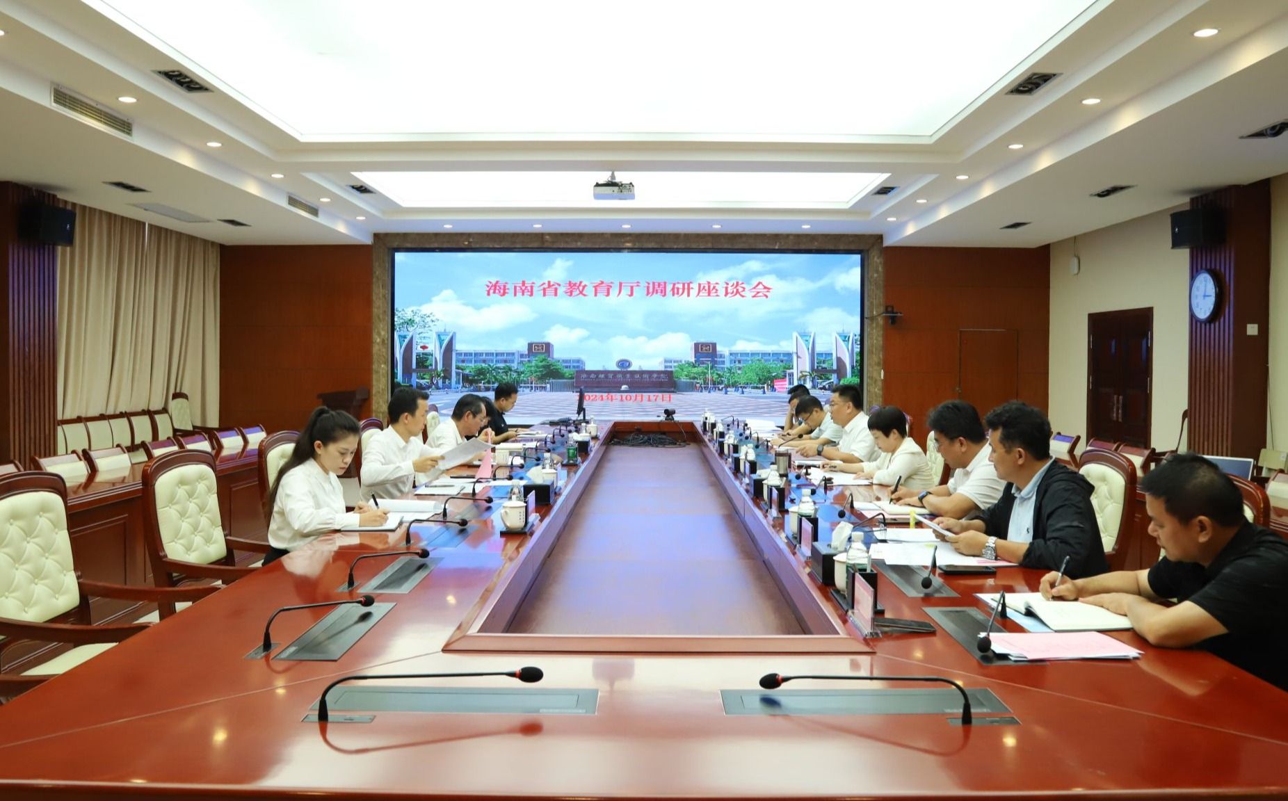 邢孔政听取了相关工作汇报,肯定了学校凝心聚力推动高质量发展所取得的成效。他说,海经贸要在现有办学条件的基础上,充分整合提升资源,对照本科职业大学基本办学条件,在基础设施、师资队伍、人才培养等方面补齐短板,拓展办学空间,优化师资结构,加快推进新项目建设,不断增强服务海南自由贸易港建设能力,高质量地做好本科职业大学申办工作。