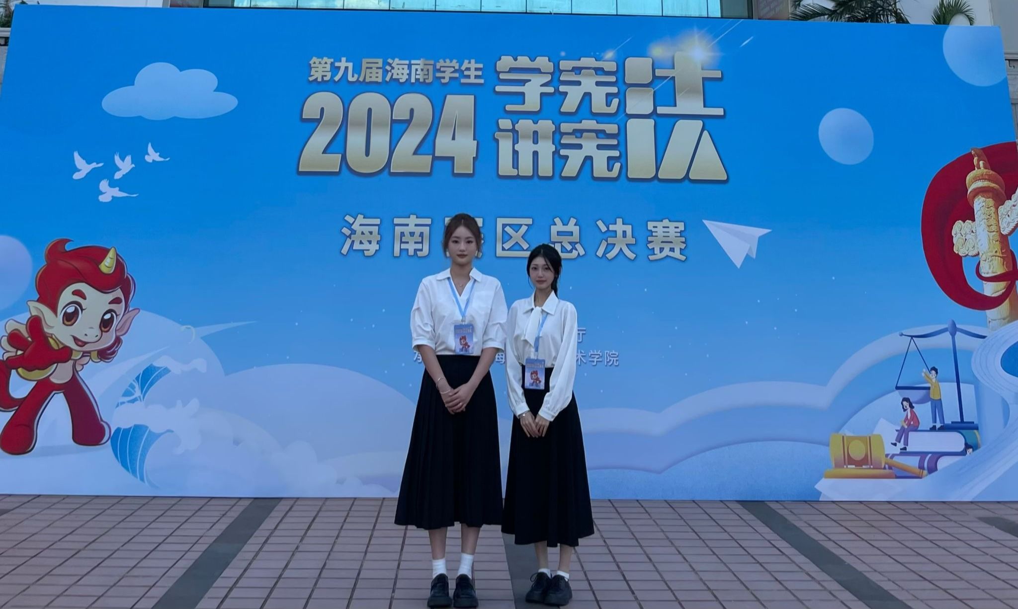决赛当天,蒋芷璇、王佳婧两位同学与兄弟院校法学专业学生同台竞技、激烈比拼,围绕“尊崇宪法、学习宪法、遵守宪法、维护宪法、运用宪法”主题进行命题演讲和知识素养竞赛,展示了扎实的专业知识与技能,充分展现了海经贸学子对宪法知识的深刻理解、熟练掌握和在实践中运用法律知识的能力。