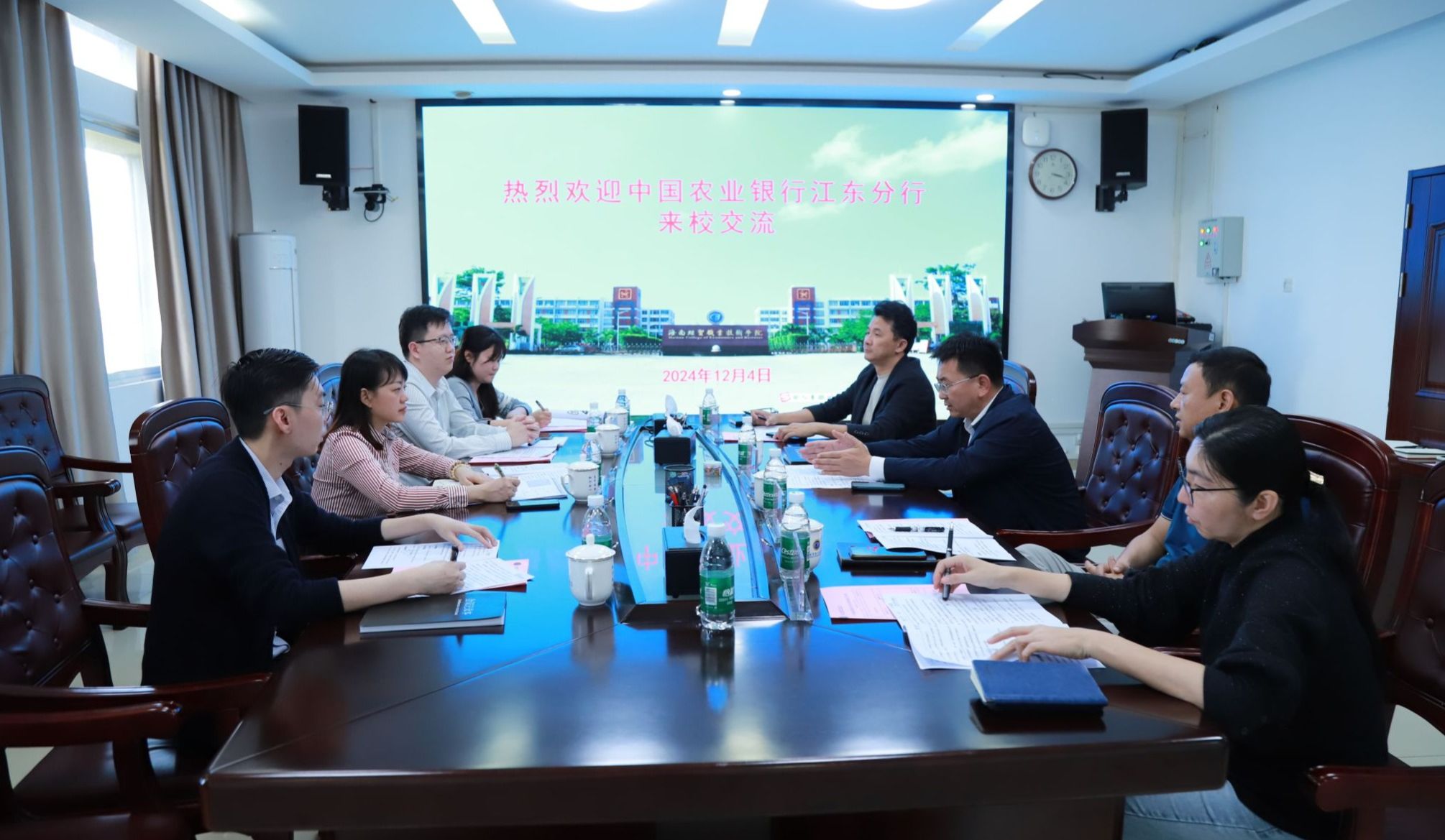 2024年12月4日,中国农业银行江东分行副行长蔡瑾琳一行四人来到beat365英国官网网站,就银校合作事宜进行洽谈。学校党委副书记、校长崔昌华出席座谈会。