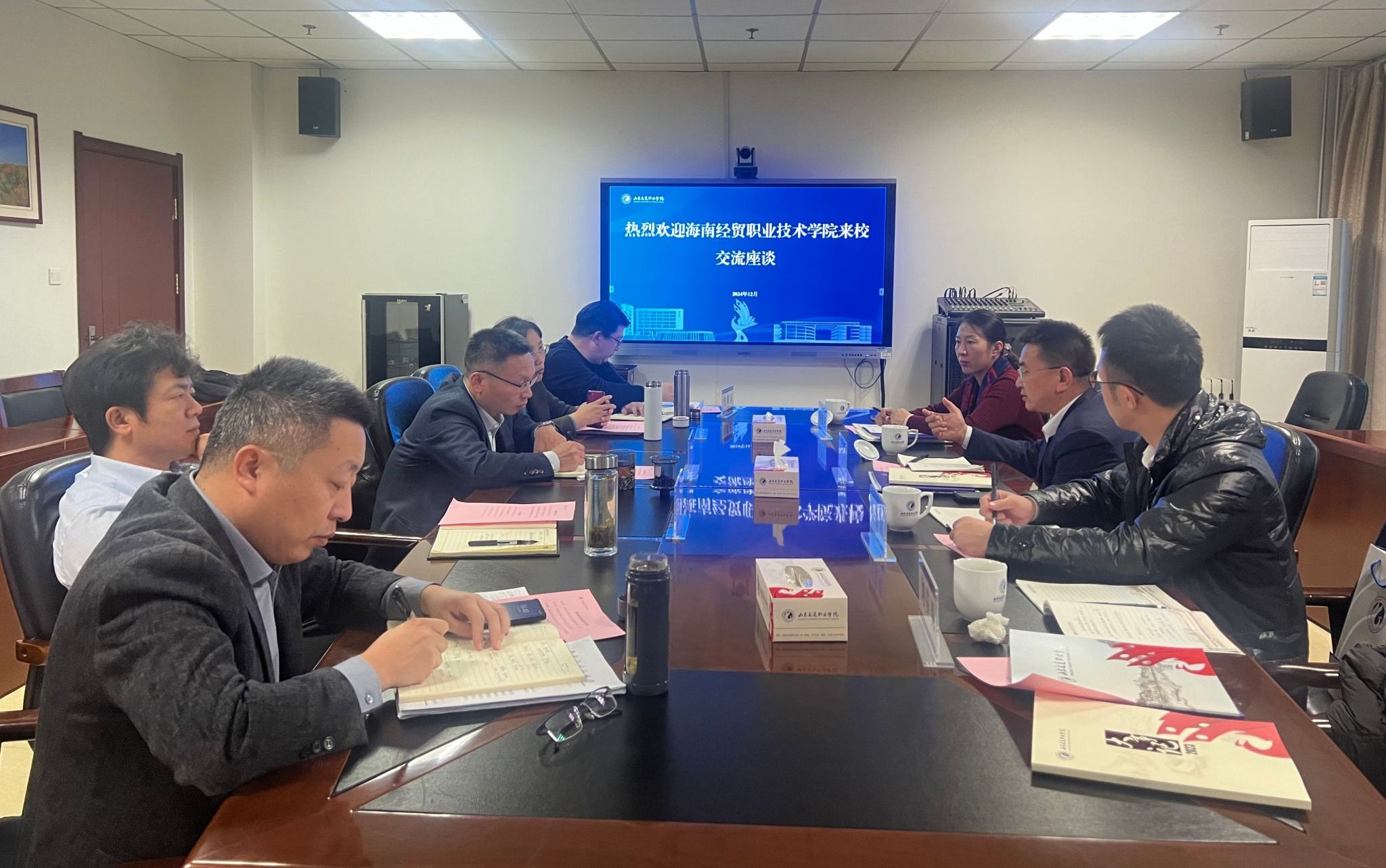 山东交通职业学院党委副书记、校长楚金华介绍了山东交通职业学院的基本情况。在他的陪同下,海经贸一行参观了山东潍坊船员考试评估中心、汽车综合实训基地、汽车西广场(消防模拟舱、工业遗存、商用飞机、火车)、航空147育训基地、航空广场波音737、空客A320 、交通土建智慧建造基地,听取山东交通职业学院关于实训室建设等情况介绍。