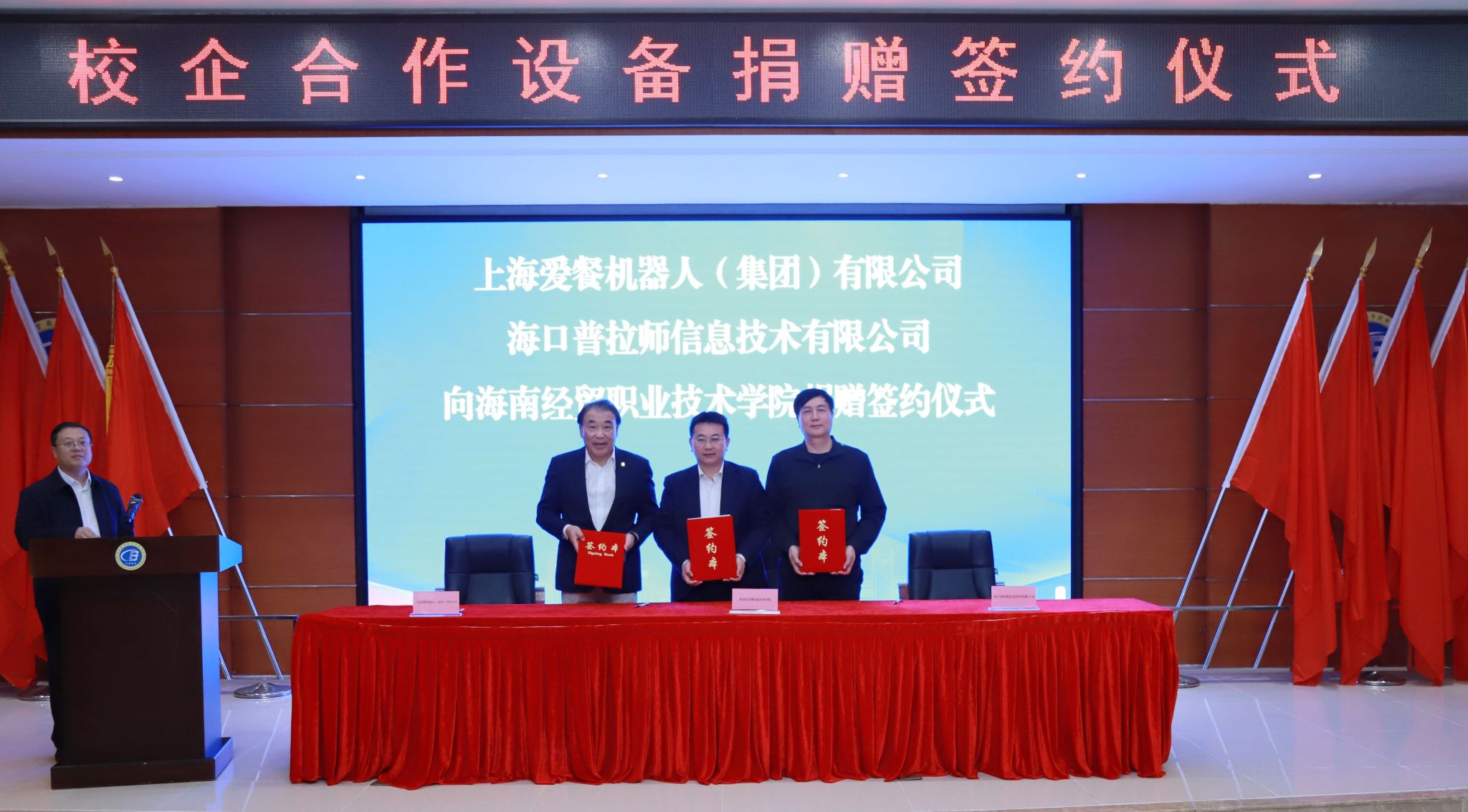 活动现场举行了捐赠签约和捐赠设备交接仪式。上海爱餐公司向海经贸捐赠 10 台厨神教练机,专用于学校智慧烹饪实训室教学。海口普拉师公司作为上海爱餐公司的本地服务商,将协助完成设备的安装调试,为学校提供后续技术支持。学校接受捐赠,并设立爱餐智慧烹饪实训室。