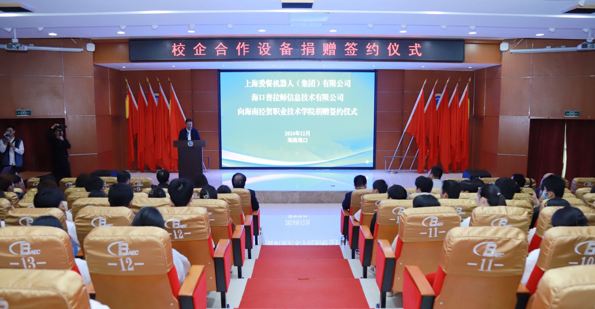 2024年12月21日,上海爱餐机器人(集团)有限公司、海口普拉师信息技术有限公司在beat365英国官网网站学术交流中心举办烹饪机器人捐赠仪式。学校党委副书记、校长崔昌华,上海爱餐机器人(集团)有限公司董事长何青、海口普拉师信息技术有限公司董事长张伟朝出席仪式。学校党委委员、副校长李厚永主持仪式。