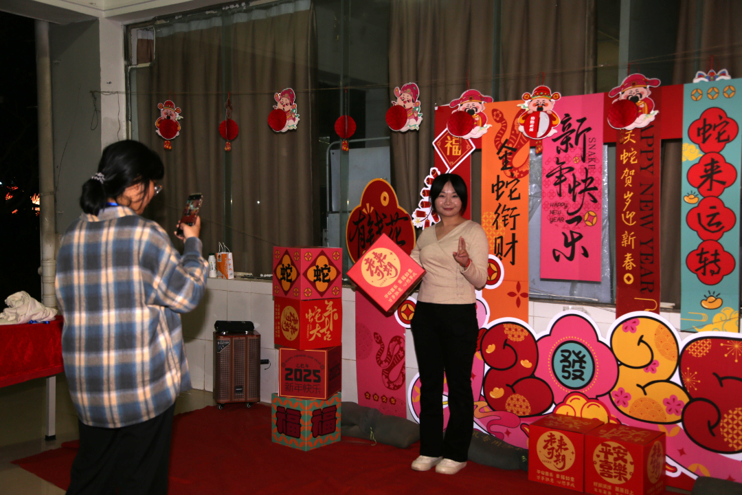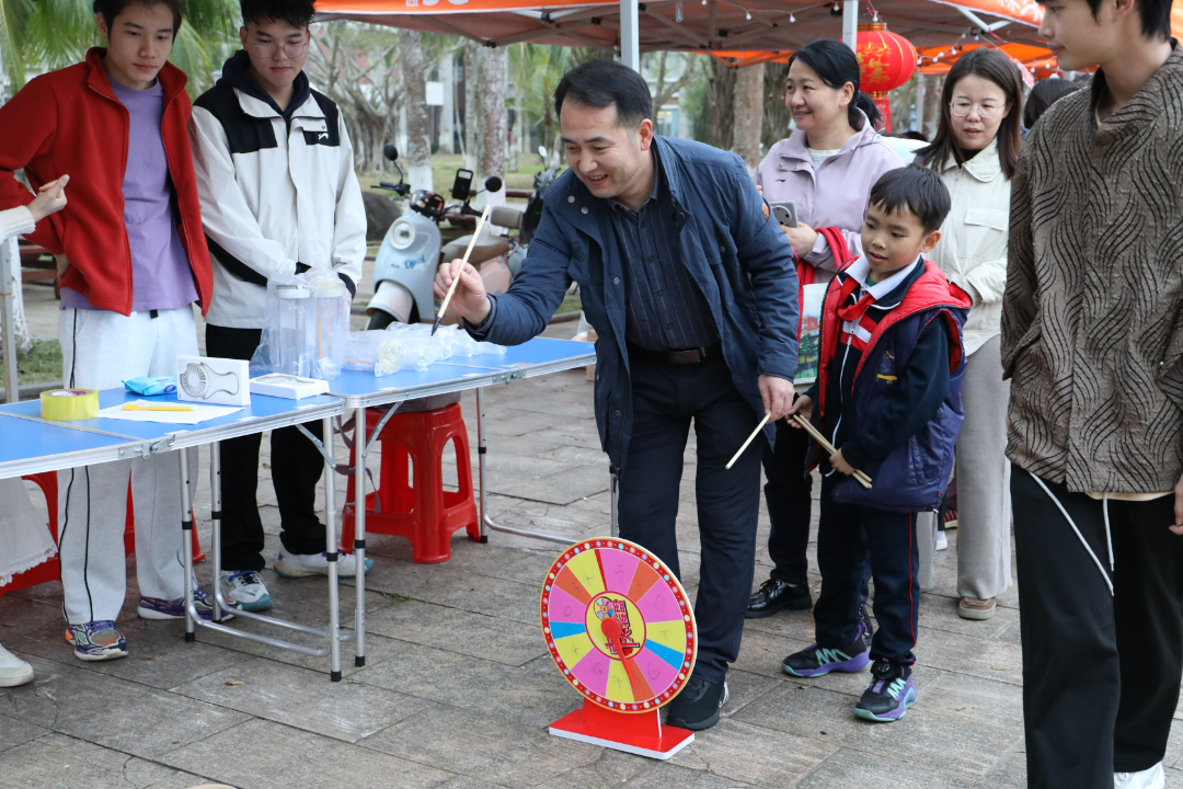 活动现场张灯结彩,节日气氛热烈而浓厚,处处彰显着传统文化的独特魅力。“哇!我砸中了”“一、二、三,瞄准,投”“天哪!我竟然套中了”“这个灯谜也太难了吧” ……校团委、各二级学院以及学生社团设置的各个摊位前人潮涌动、热闹非凡,一系列精心设计、兼具趣味与文化底蕴的互动项目吸引着老师同学们踊跃参与。每个游戏项目前都排起了长队,大家乐此不疲地“四处征战”,在欢声笑语中挥手告别2024。